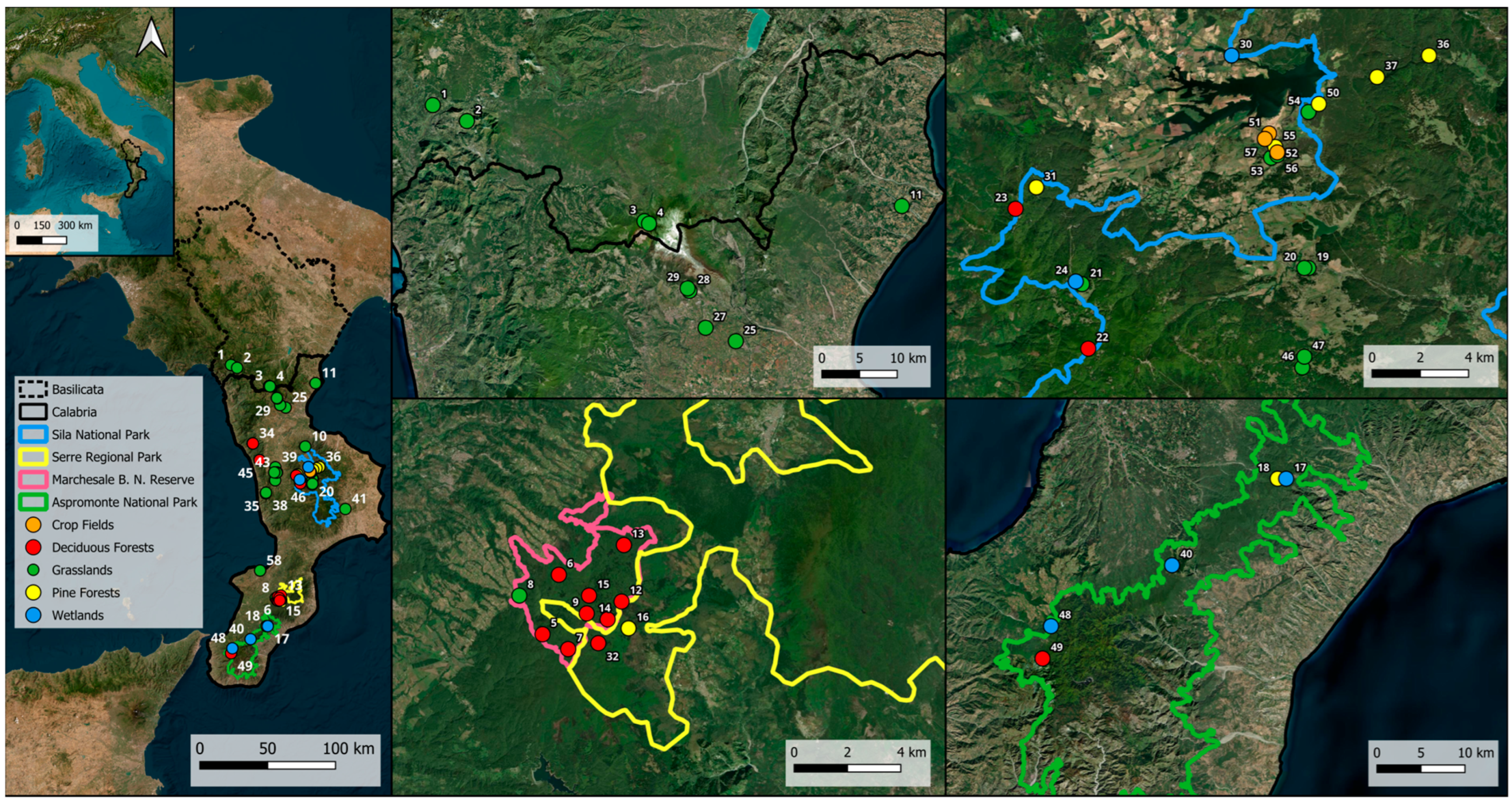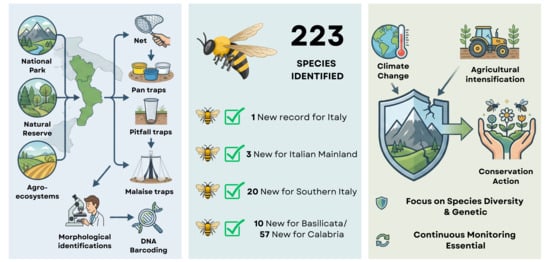 - Vommaro, M.L.; Lento, M.; Michez, D.; Flaminio, S.; Flori, S.; Treccosti, I.; Di Prisco, G.; Goglia, L.; Brandmayr, P.; Giglio, A. Assessing wild bee fauna (Hymenoptera: Apoidea: Anthophila) in Calabria (southern Italy). Eur. Zoo. J. 2025, 92, 769–780. [Google Scholar] [CrossRef]