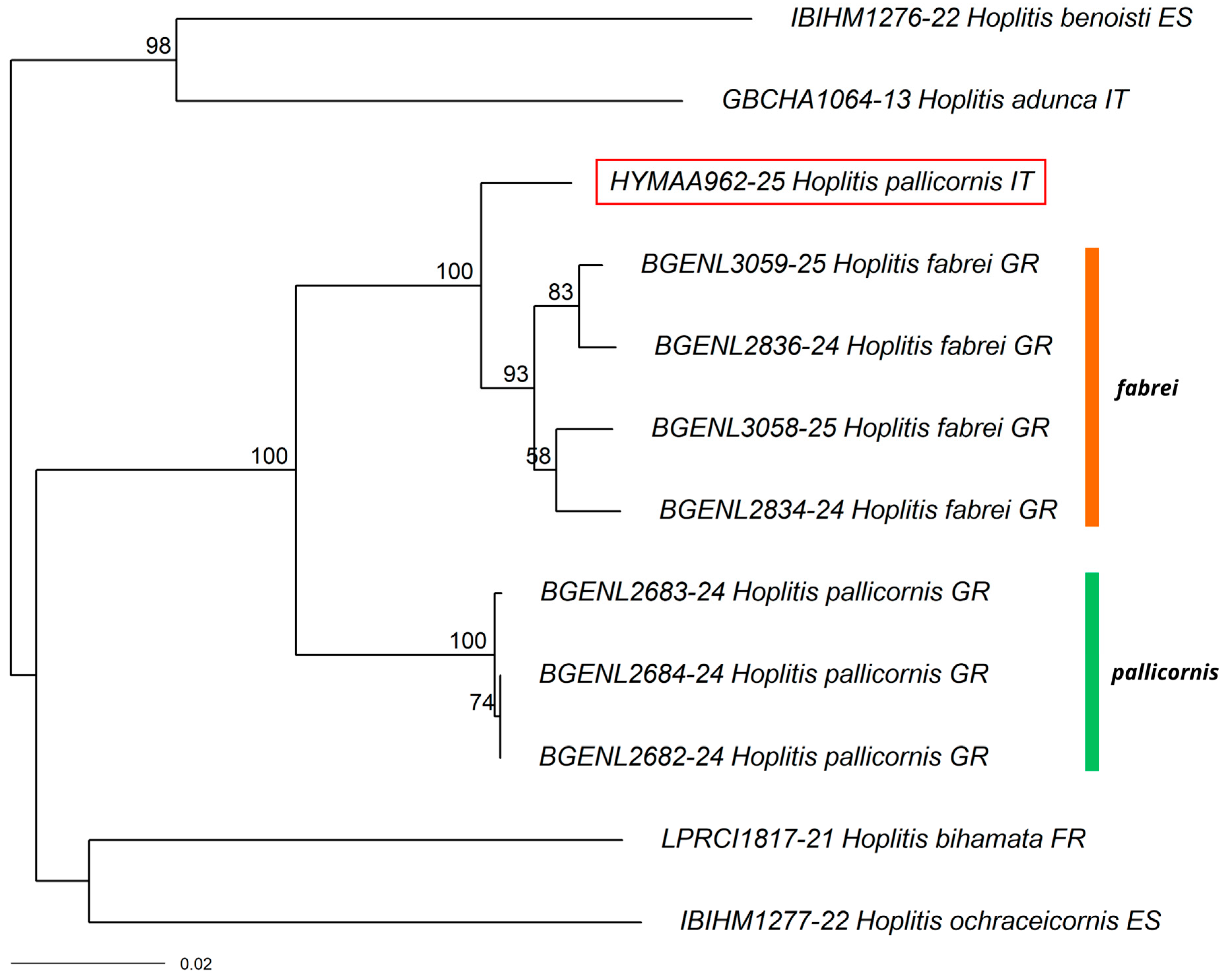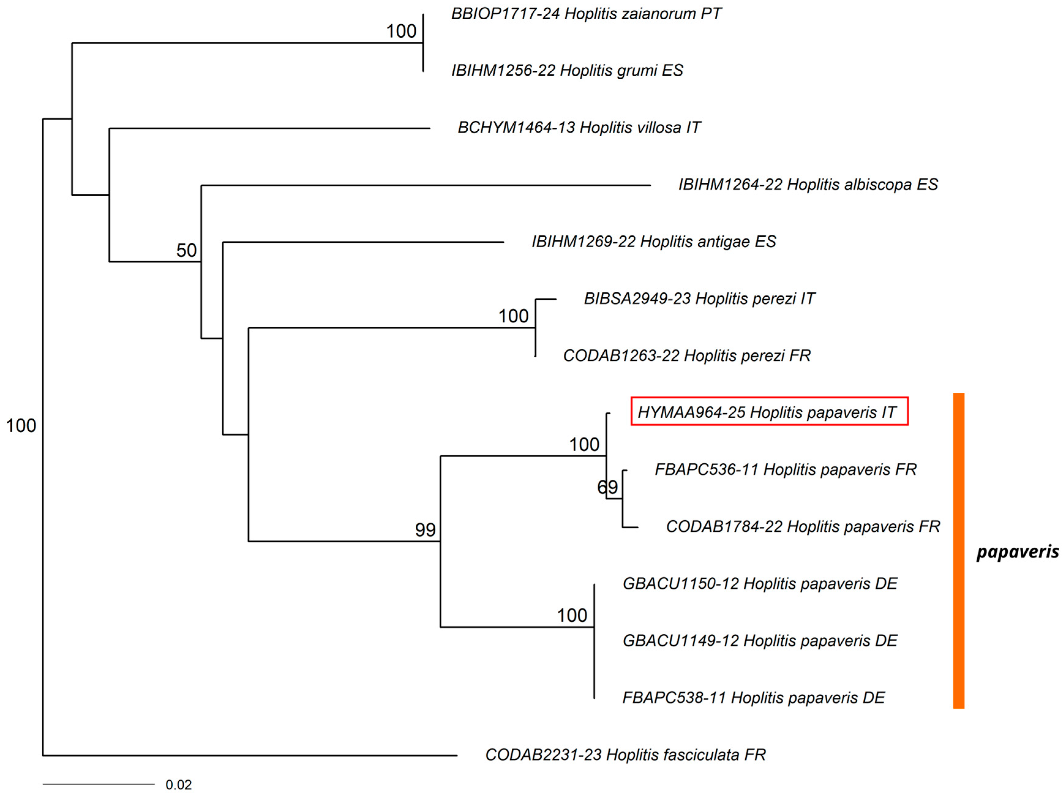 - Sedivy, C.; Dorn, S.; Müller, A. Molecular phylogeny of the bee genus Hoplitis (Megachilidae: Osmiini)—How does nesting biology affect biogeography? Zool. J. Linn. Soc. 2013, 167, 28–42. [Google Scholar]