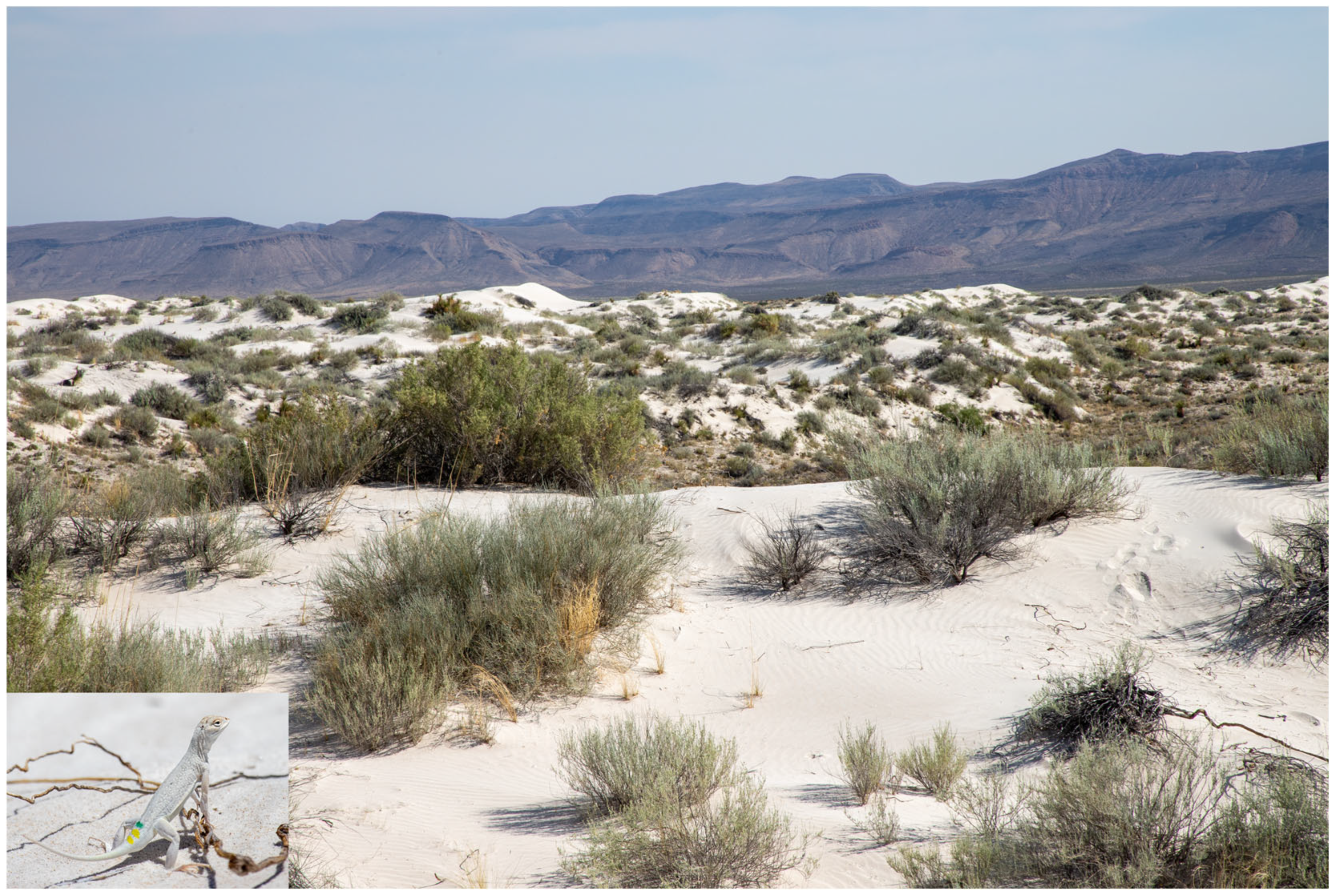 - Orton, M.M.; Eifler, M.A.; Utsumi, K.L.; Laurentino, T.G.; Siddiqui, D.; Haddock, J.B.; Quock, R.; Eifler, D.A. Holbrookia maculata space use in the Salt Basin Dunes of the Guadalupe Mountains National Park. Herpetol. Rev. 2024, 55, 7–10. [Google Scholar]