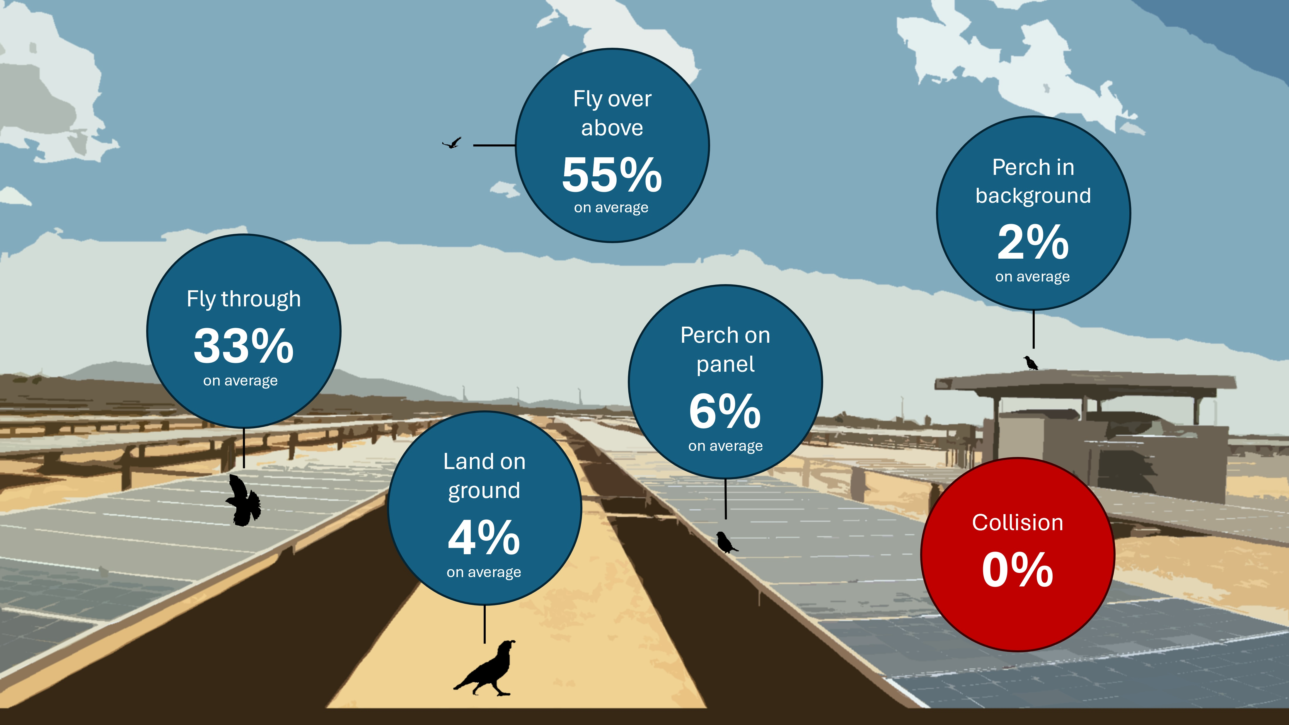 | Perch on panel | Flying in and landing on any part of the solar panels, including supporting infrastructure, or perching on a panel and flying away. |