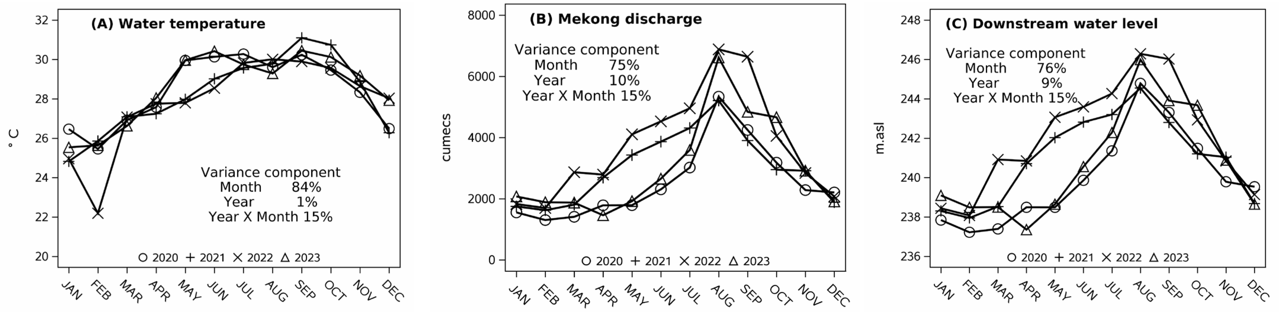 - Eschenroeder, J.C.; Lee, D.; Ounboundisane, S.; Chea, S.; Seat, L.; Robinson, W.A.; Thorncraft, G.A.; Pomorin, K.; Ning, N.; Thiem, J.D.; et al. Mekong Migrations: Insights Into Fish Movement in the Lower Mekong From a Large-Scale Acoustic Telemetry Study. Fish. Manag. Ecol. 2025, 32, 330–348. [Google Scholar] [CrossRef]