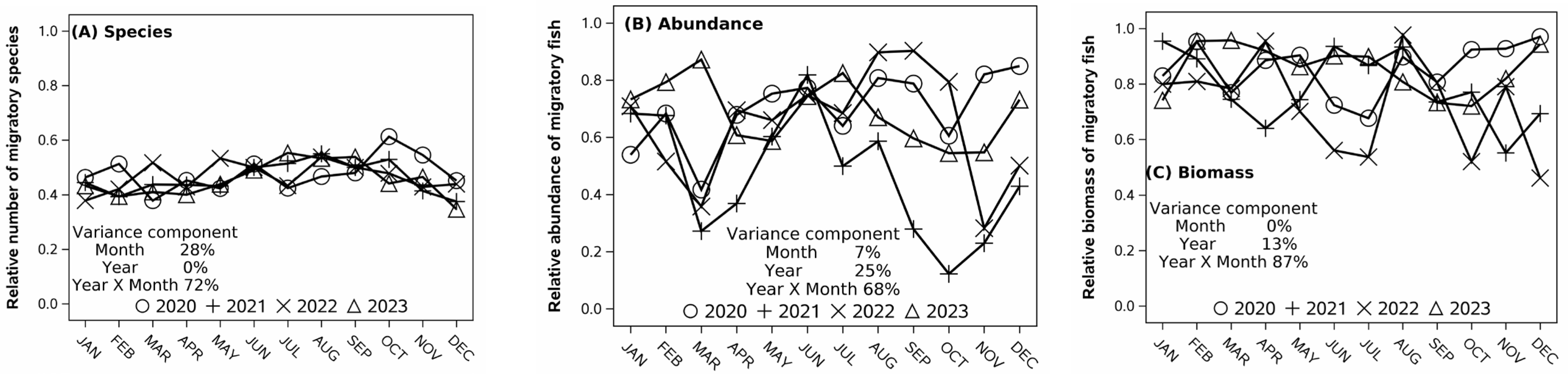 3.5. Migratory Guild Composition—Temporal Variations in Relative Abundance and Biomass
