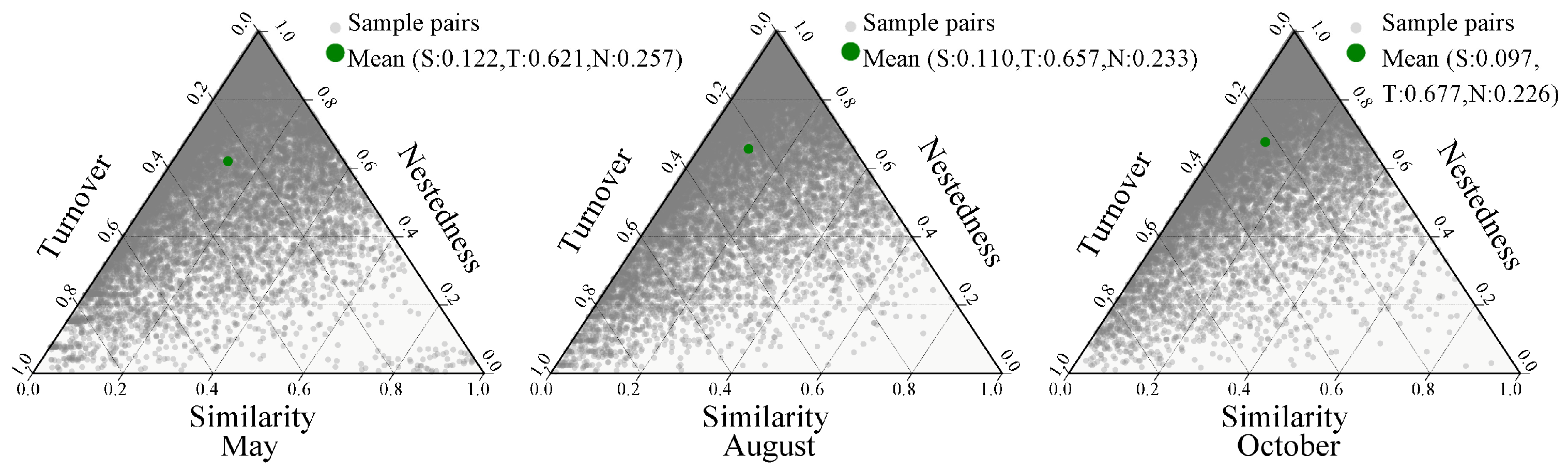 - Baselga, A.; Orme, C.D.L. Betapart: An R Package for the Study of Beta Diversity. Methods Ecol. Evol. 2012, 3, 808–812. [Google Scholar] [CrossRef]