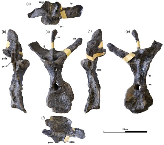 Likely also diagnostic (modified from [21]): fusion of some of the cervical ribs to para- and diapophyses of cervical vertebrae; mid and posterior caudal centra wider than tall; mid and posterior caudal centra taller than long; mid and posterior caudal centra with deeply concave lateral sides; dorsal ribs ‘C’ shaped in cross-section proximally.