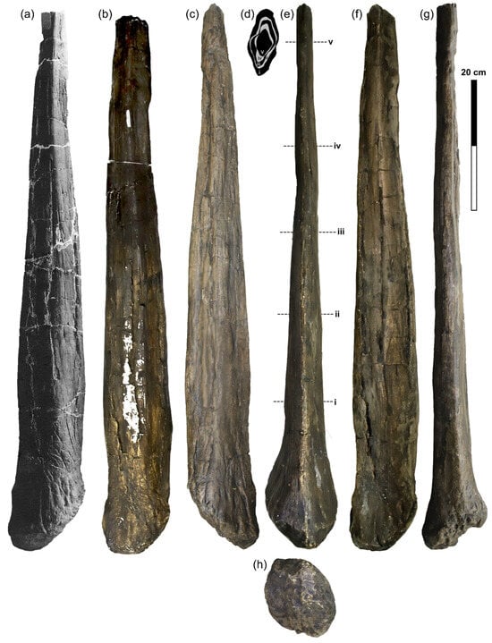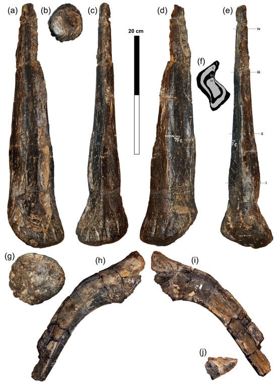 Caudal spine (right) and dorsal rib (right) of Miragaia sp. YPM PU 1455: (a–g) caudal spine; (h–j) dorsal rib; (f) stacked transverse cross-sections of caudal spine (approximate corresponding section identified in (e) as the dashed lines i–iv); (a) in lateral (right) view; (b,f) in distal (dorsal) view; (c,h) in anterior view; (d) in medial (left) view; (e,i) in posterior view; (g) in proximal (ventral) view; (j) in distal (ventral) view. Scale bar equals 20 cm.