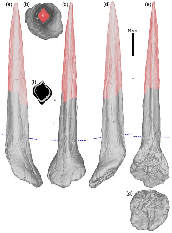 Caudal spine (right) of Miragaia sp. from MOAL: (a) in lateral (right) view; (b,f) in distal (dorsal) view; (c) in anterior view; (d) in medial (left) view; (e) in posterior view; (g) in proximal (ventral) view; (f) stacked transverse cross-sections of caudal spine (approximate corresponding section identified in (c) as the dashed lines i–iii). Colored in red is the likely reconstructed section (from observations of the replica at NOVA-FCT), grey is the likely extension of fossil bone. Dashed lines in blue indicate approximately the level at which the original fossil at MOAL appears lighter (below) and darker (above). Screenshots of 3D model of replica from NOVA-FCT. Scale bar equals 20 cm.