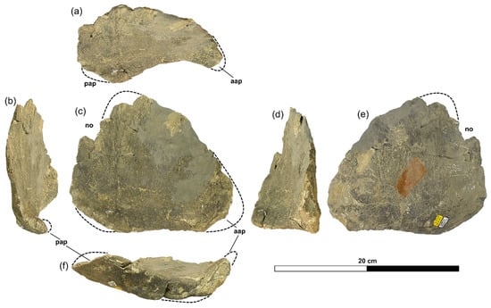 Cervical plate (right) of cf. Miragaia longicollum UMNH VP 5572: (a) in dorsal (distal) view; (b) in posterior (distal) view; (c) in lateral (right) view; (d) in anterior view; (e) in medial (left) view; (f) in ventral (proximal) view. For anatomical abbreviations used, see Abbreviations section. Scale bar equal to 20 cm. Photographs kindly provided by Shoji Hayashi.