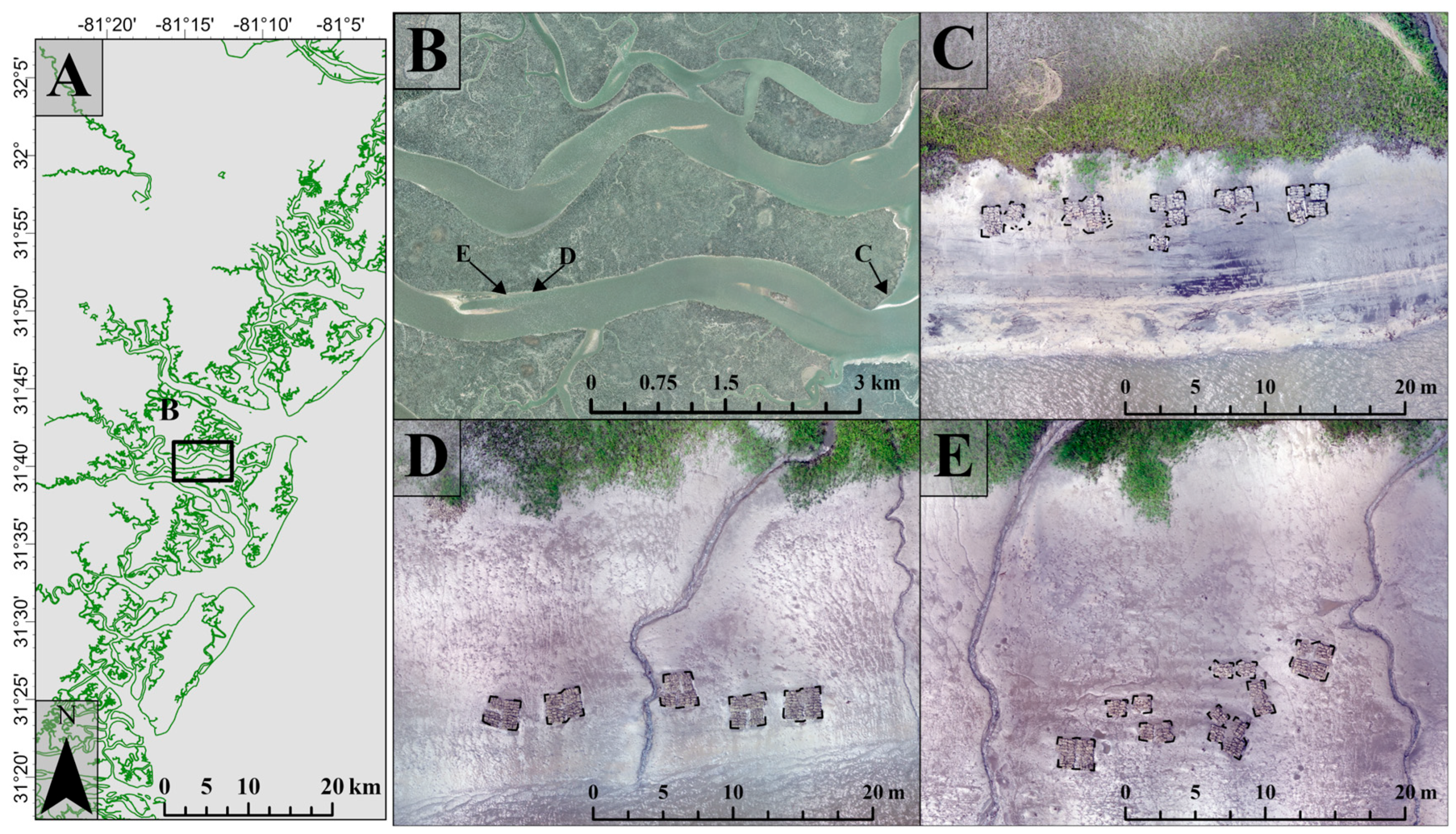 - Currin, H.M. Remote Sensing of Georgia Tidal Marsh Habitats Using Aerial Photography and Planetscope Satellite Imagery. Masters Thesis, Georgia Southern University, Statesboro, GA, USA, 2023. [Google Scholar]
