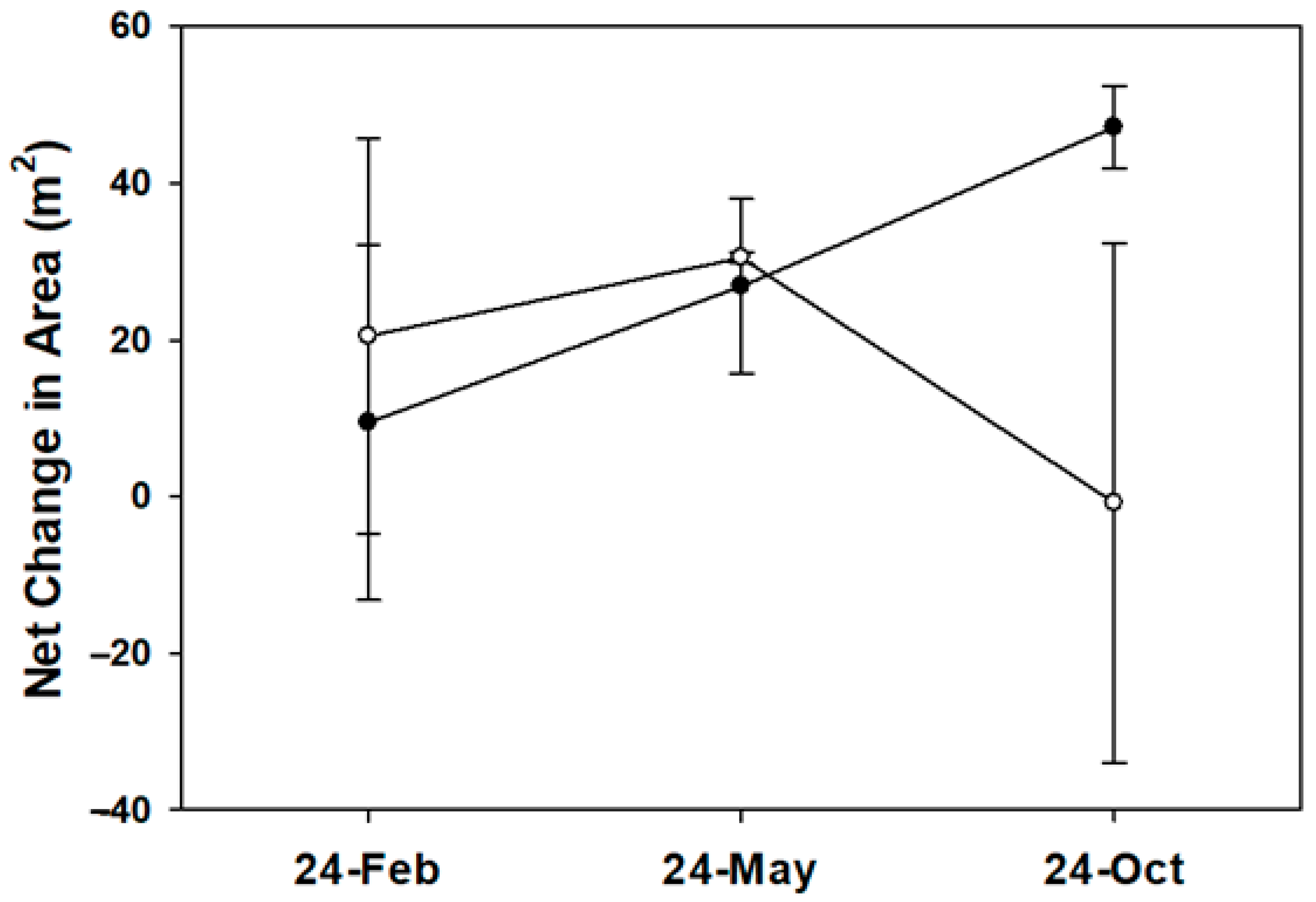 | Site Placement | Site | Mar. 2023– Feb. 2024 | Feb. 2024– May 2024 | May 2024– Oct. 2024 | Net Area Change (m2) | Shoreline Length (m) | Movement Rate (m·yr−1) |