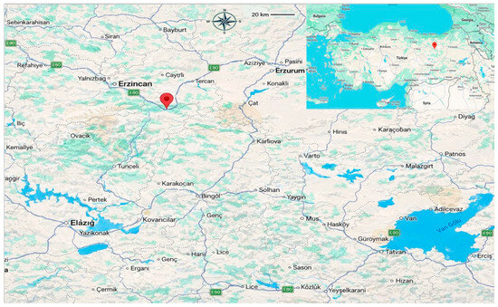 The Karasu River, located in the Eastern Anatolia Region of Türkiye, originates from Dumlu Mountain in Erzurum province and merges with the Murat River near Keban to form the Euphrates River [21]. Fish samples of Capoeta umbla and Capoeta trutta were obtained from commercial fishermen at a designated sampling station (39°33′03.6″ N 40°03′45.5″ E) (Figure 1) along the Karasu River within the borders of Erzincan Province. The fish were purchased dead from a local commercial fish market, where they were obtained as part of routine commercial fishing operations. According to information provided by the vendor, all fish were caught on the same day and stored on ice under standard commercial conditions prior to sale. Following purchase, the samples were immediately transported to the laboratory under cold conditions and processed using identical handling procedures to minimize post-mortem and storage-related variability. Sampling was conducted monthly between April 2023 and March 2024 to represent seasonal variation. Fish were captured using gill nets with three different mesh sizes (16 × 16 mm2, 22 × 22 mm2, and 32 × 32 mm2), following standardized instructions provided to the fishermen. Water temperature was measured in situ at the location during the sampling period, and seasonal mean values were calculated.
