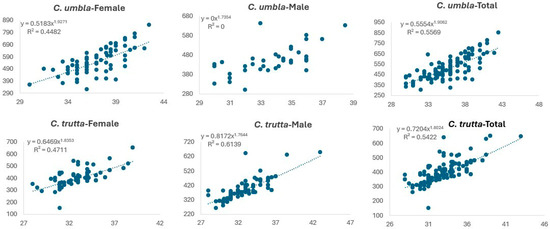 Length–weight relationships of C. umbla and C. trutta genders from the Karasu River during the sampling seasons.