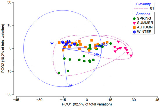 Two-dimensional configuration plot of a PCO analysis of a resemblance matrix of C. trutta antioxidant biomarkers in different seasons. The lower triangular matrix was created using Bray–Curtis similarity coefficients. Pearson Correlation > 0.65.