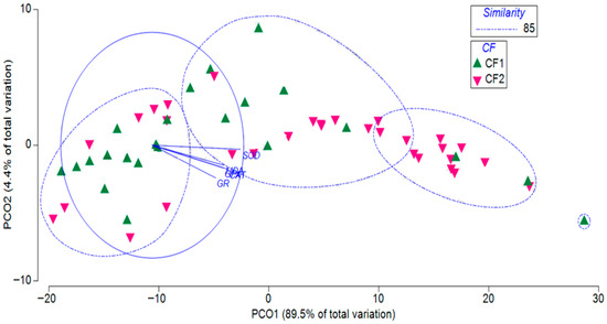 Figure 5 shows the two-dimensional configuration plot of the PCO analysis of the similarity matrix of the effect of antioxidant biomarkers of C. umbla on CF groups (CF1: ≤1.13, CF2: >1.13). The CF1 and CF2 groups showed considerable overlap, with a similarity of 85%. The vectors representing antioxidant biomarkers indicate the direction and relative contribution of each biomarker to the observed variation, with SOD and GR having the strongest influence.