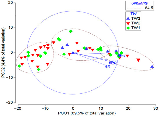 Figure 6 shows a two-dimensional configuration plot of the PCO analysis of the similarity matrix of the effect of antioxidant biomarkers in C. umbla on TW factor groups (TW1: ≥150–360 g; TW2: >360–450 g; TW3: >450–650 g). The TW1, TW2, and TW3 groups exhibited partial overlap, with an overall similarity of 84.5%. The vectors representing antioxidant biomarkers (SOD, GR, CAT, GPx, and MDA) indicate the direction and relative contribution of each biomarker to the observed variation.