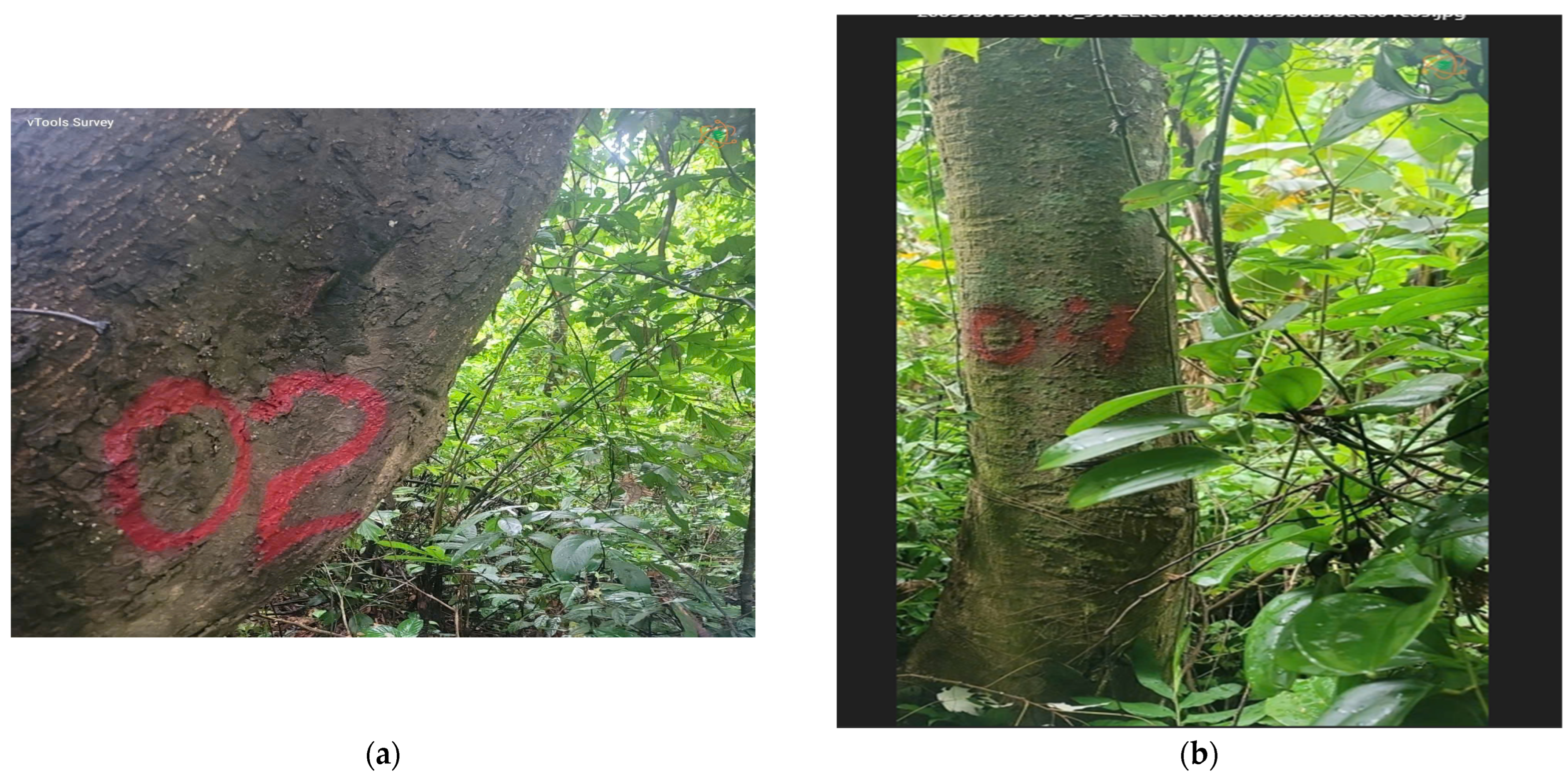 3.2. Identifying Several Rare and Endangered Timber Species in the Than Sa–Phuong Hoang Nature Reserve
