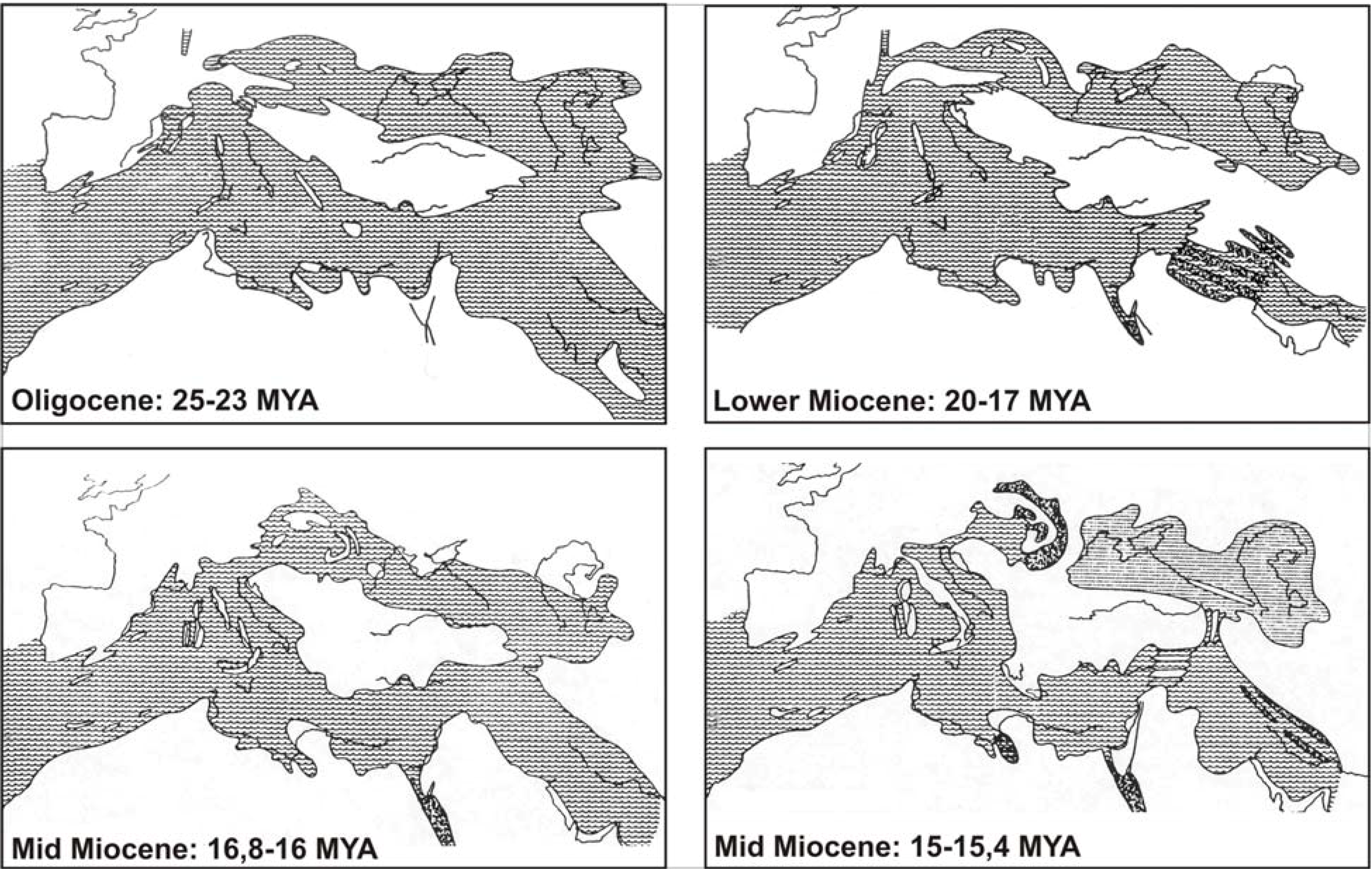 Palaeogegraphic reconstruction of the Mediterranean until the Mid Miocene after [3].