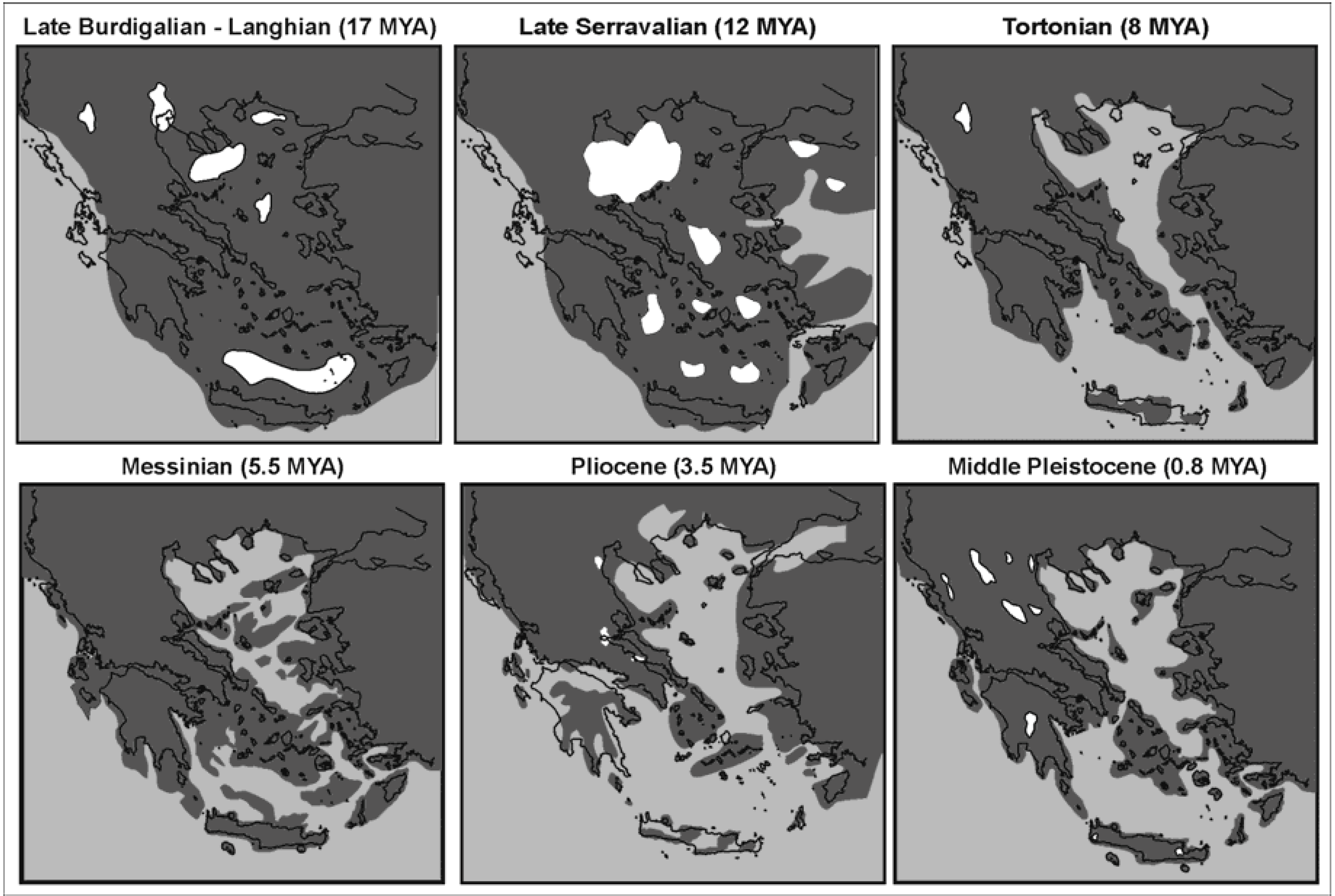 The main distribution patterns in the Aegean are related to geological time. The “ancients” group consists only of Palaearctic animals, whereas in the other cases African animals are involved as well. Nevertheless, the general patterns are general insofar as we observe them at a broad scale. Each group studied has its peculiarities in what regards the routes followed, refugia (and microrefugia) they originated from, mechanisms involved (i.e., vicariant, dispersal) and degree of differentiation. This view appears consistent with the perspective given by Benton [70] i.e., predominance of abiotic factors at large temporal and geographical scales whereas at smaller scales biotic interactions may be more important.