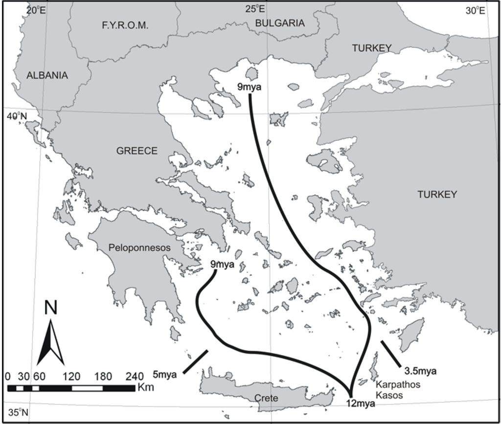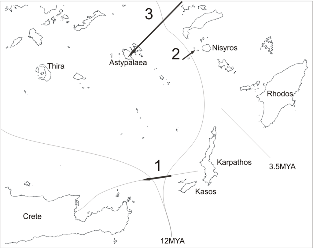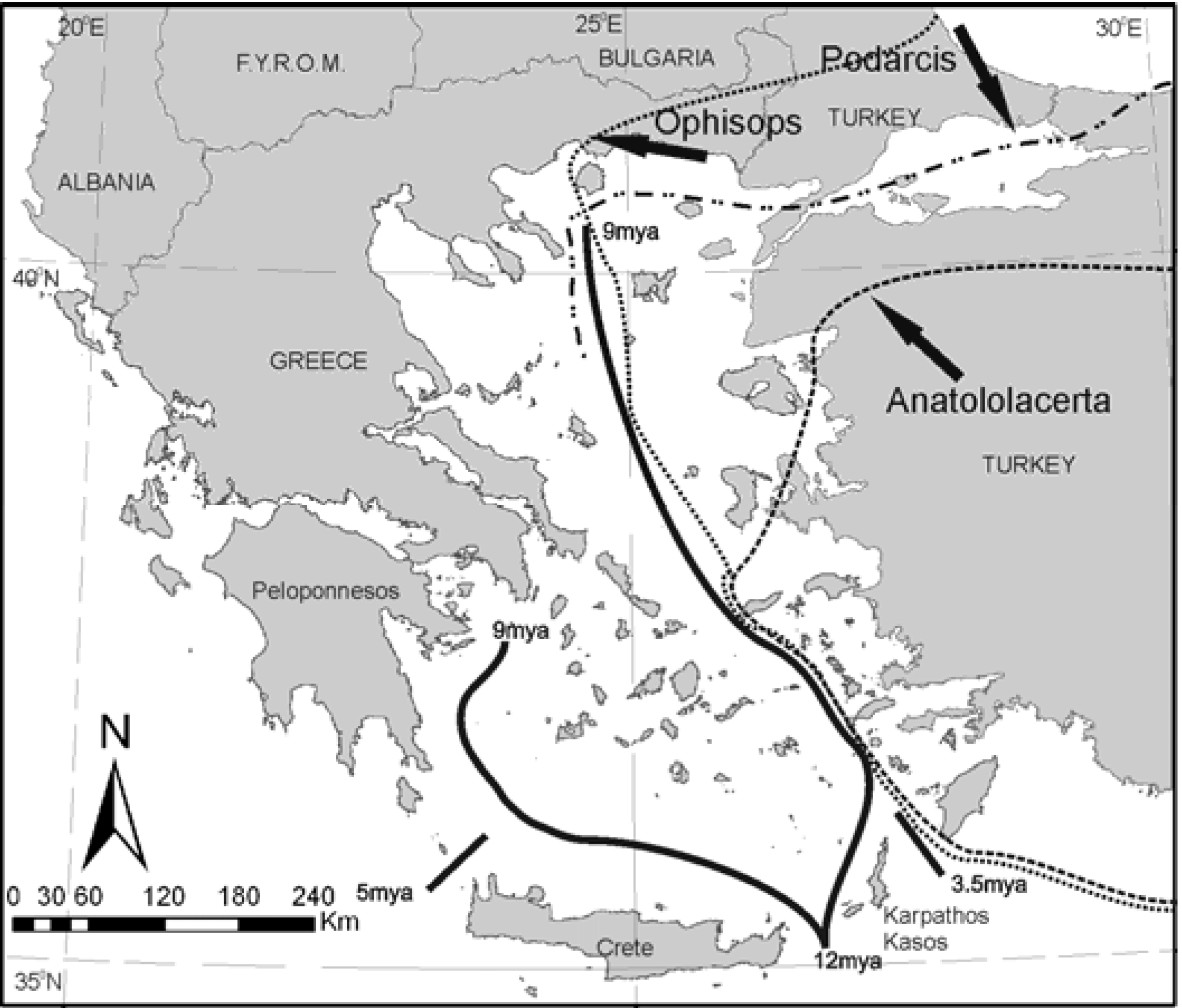 The genus Podarcis is considered to have evolved in south-west Europe and expanded eastwards [18]. However, it never made it into Asia, blocked at least in its southern range by the forming of the MAT. A different lacertid, Ophisops elegans, which arrived in the area from Asia Minor, hardly made it to Europe in Thrace, NE Greece [19]. It is possible that O. elegans arrived in the area later than 3.5 MYA since it is “unexpectedly absent from Kasos and Karpathos” as observed in [14].