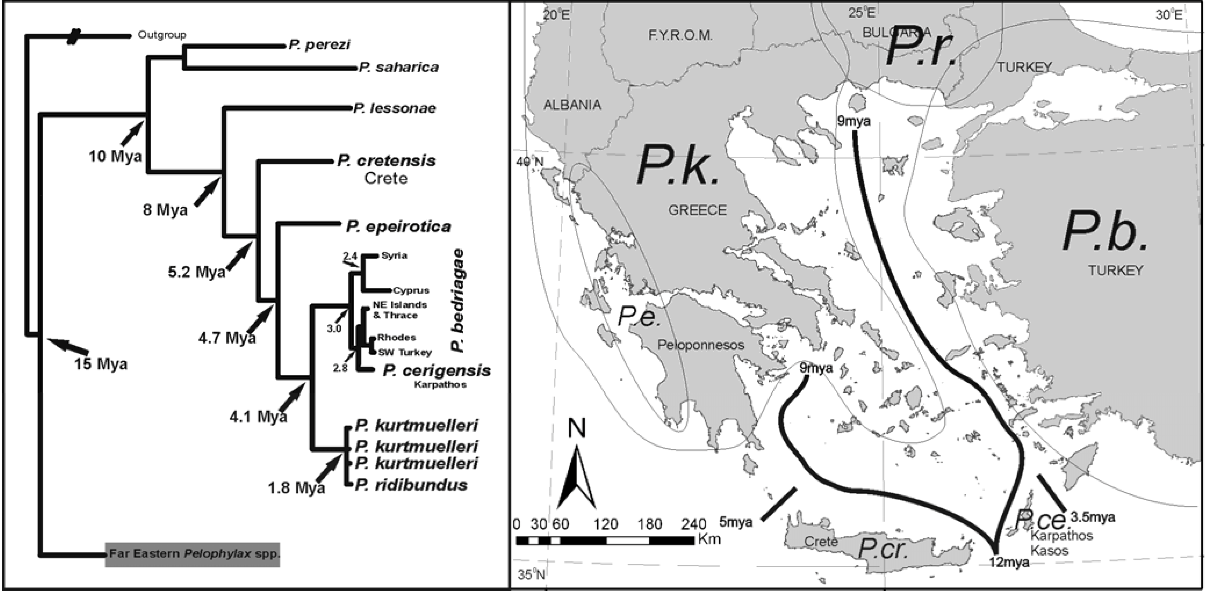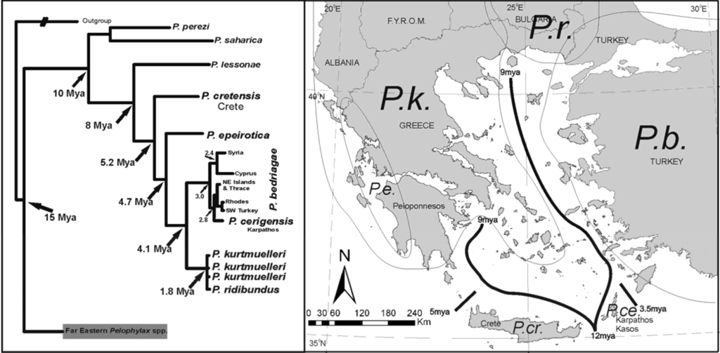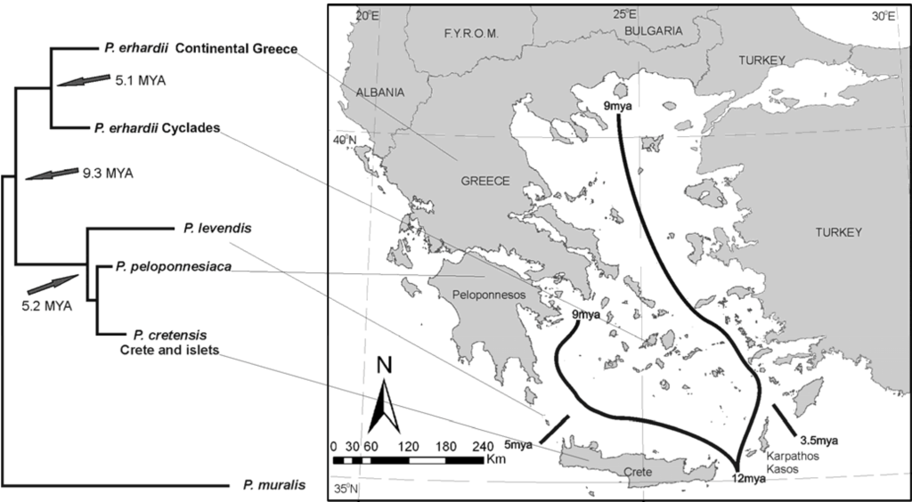 Phylogenetic relationships of P. erhardii group. Note that the taxa respect the 12-9 MYA boundaries and that contemporary species differentiate around 5 MYA, i.e., near the Messinian crisis.