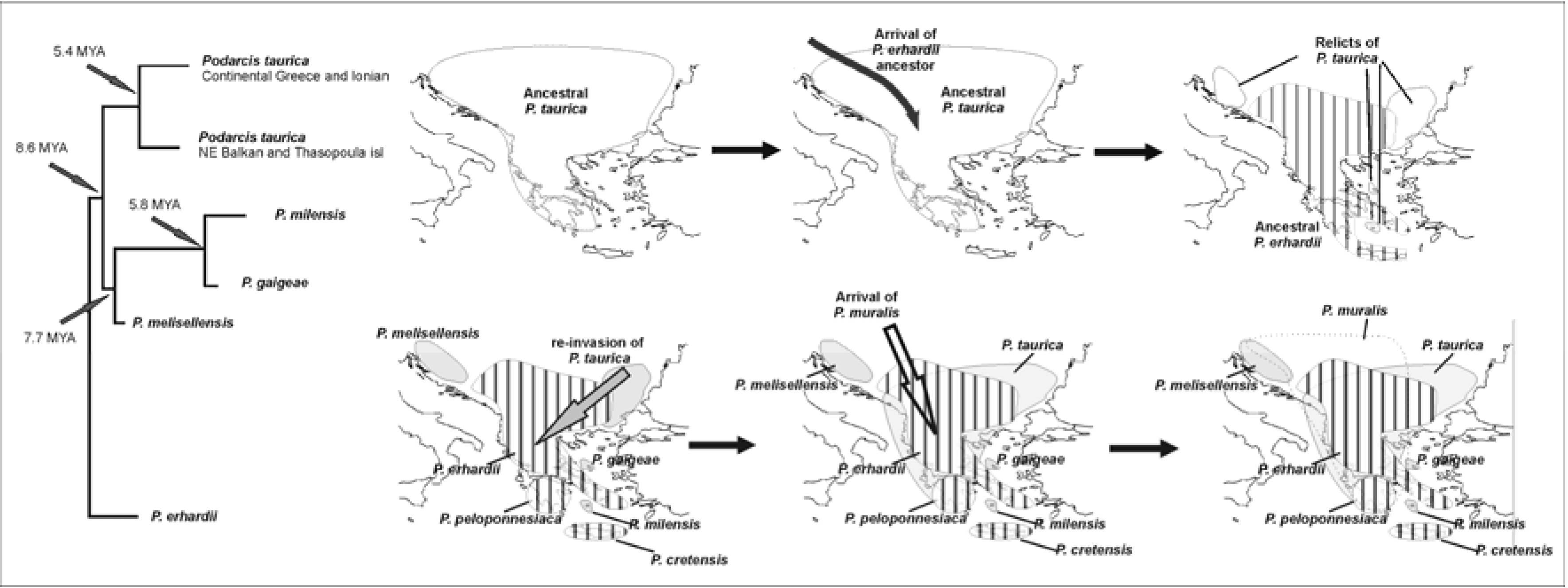 There are eight species of the genus Podarcis distributed in Greece, of which five are endemic to islands and Peloponnesos. According to their phylogenetic relationships, they can be divided into three groups: The P. erhardii group (P. erhardii, P. peloponnesiaca, P. cretensis, P. levendis), the P. taurica group (P. taurica, P. milensis, P. gaigeae) and a last group with a single representative P. muralis.
