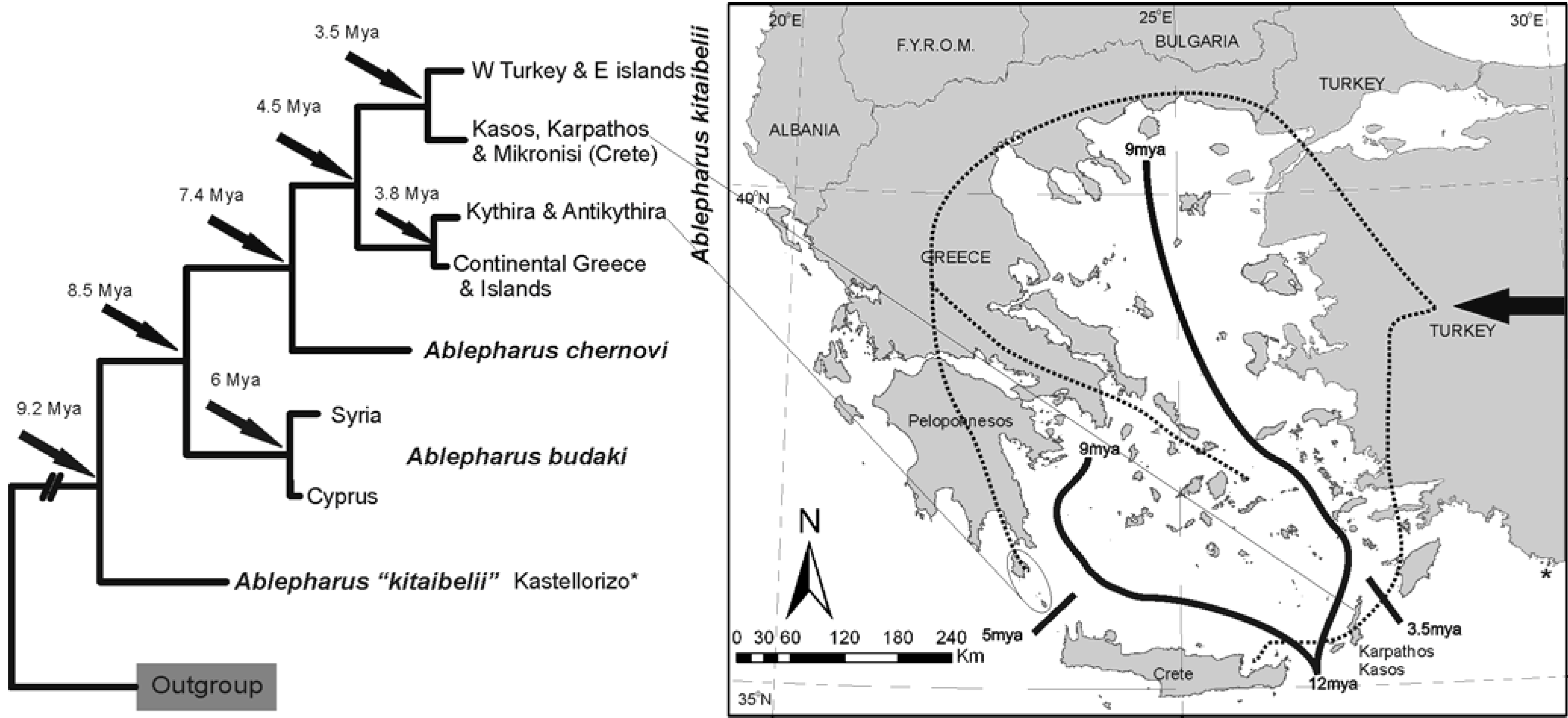 The differentiation of Aegean populations of Ablepharus once again begins soon after the Messinian crisis and two isolation episodes follow during the Pliocene. The population of Kastellorizo (*), presumably related to populations of south-west Turkey, render A. kitaibelli paraphyletic. Detailed sampling in that area may reveal further hidden diversity.