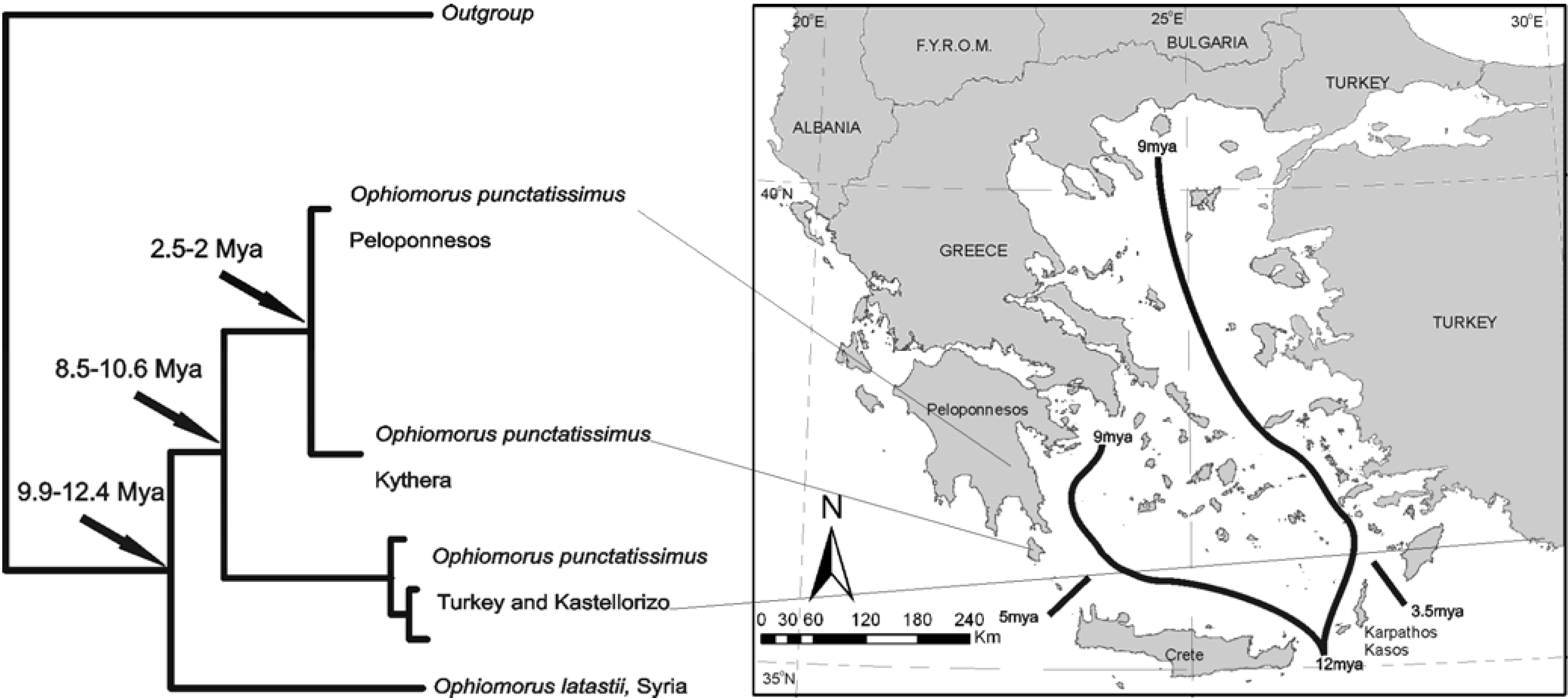 Phylogenetic relationships and distribution of Ophiomorus taxa in the area. The most plausible scenario is that the species existed in the area that was separated into two with the 12-9 MYA splitting of the Aegean. If this hypothesis is correct, fossils of the species are expected to be found in Cyclades—possibly even Crete.