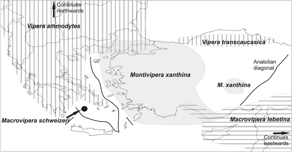 Approximate distributions of certain vipers in the Aegean area. Not mentioned in the text but shown here is V. transcaucasica, until recently considered a subspecies of V. ammodytes. Another isolated population of the species (not shown) occurs east of the Anatolian diagonal. A vicariant event and/or competition with M. xanthina may have been responsible for the gap in V. ammodytes distribution. Note that despite their long history in the area, vipers respect the MAT as well as the Anatolian Diagonal and they appear to have never reached the southern Aegean.