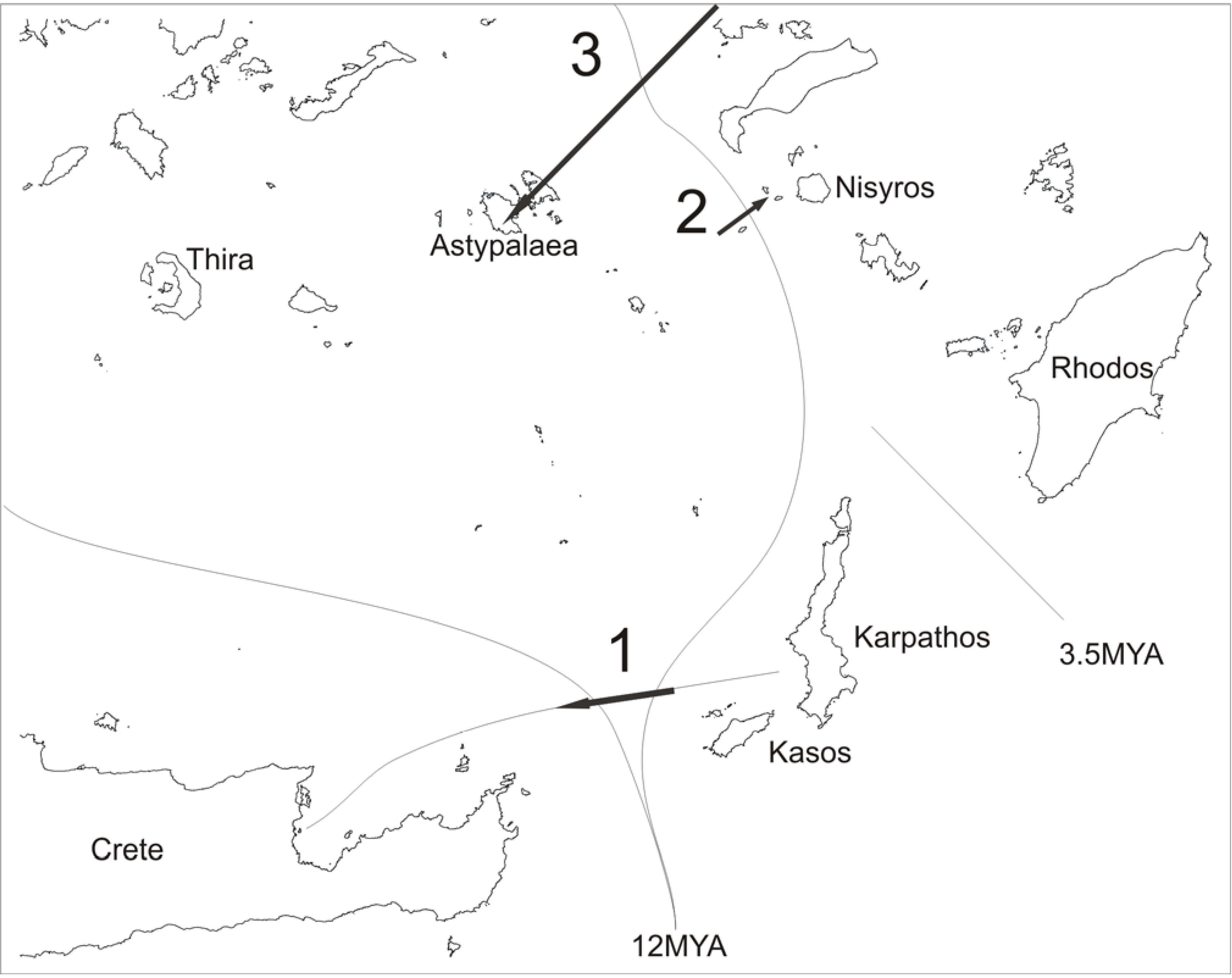 These include: (A) the opening of the Mid-Aegean Trench (MAT hereafter), which initiated by the splitting of Crete from Kasos-Karpathos and Asia Minor. This initial split bifurcated, forming the MAT at a north south axis and a second split in a SE-NW axis separating Crete and Peloponnesos from the Cyclades islands. (B) The separation of Crete from Peloponnesos after the Messinian crisis and (C) the separation of Kasos-Karpathos from Rhodes (and Asia Minor) during the Pliocene. We examine if and how the species’ contemporary distributions fit this frame and propose alternative hypotheses if not. Moreover, we examine the causal factors, i.e., vicariance or dispersal, which may account for the observed distribution. Finally, where possible, we fit a time scale to our explanations, in search of possible historical events that may have affected the evolution of more species simultaneously.