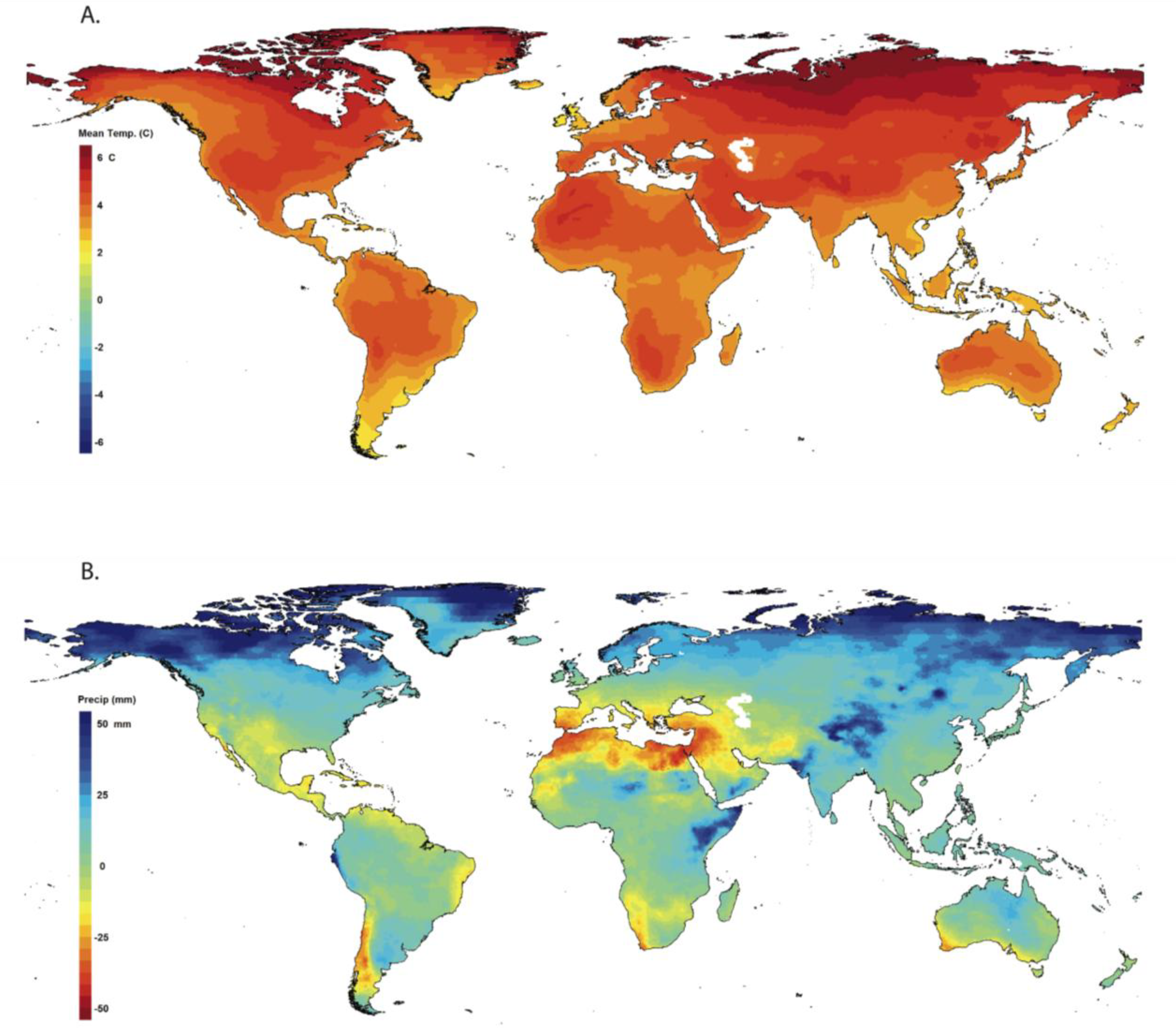Projected changes in (A) mean annual temperature, and (B) total annual precipitation. All changes are for an averaged period from 2070 to 2099 relative to an averaged period from 1961 to 1990. Mapped values are the medians of projections from 16 general circulation models run for the SRES A2 emissions scenario. All 16 climate projections were created for the World Climate Research Programme’s (WCRP’s) Coupled Model Intercomparison Project phase 3 (CMIP3) multi-model dataset and used for analyses reported in the IPCC Fourth Assessment Report. The climate projections were downscaled to a 0.5-degree resolution as described in Maurer et al. [223]. The maps were created with the ClimateWizard climate data analysis tool [224].