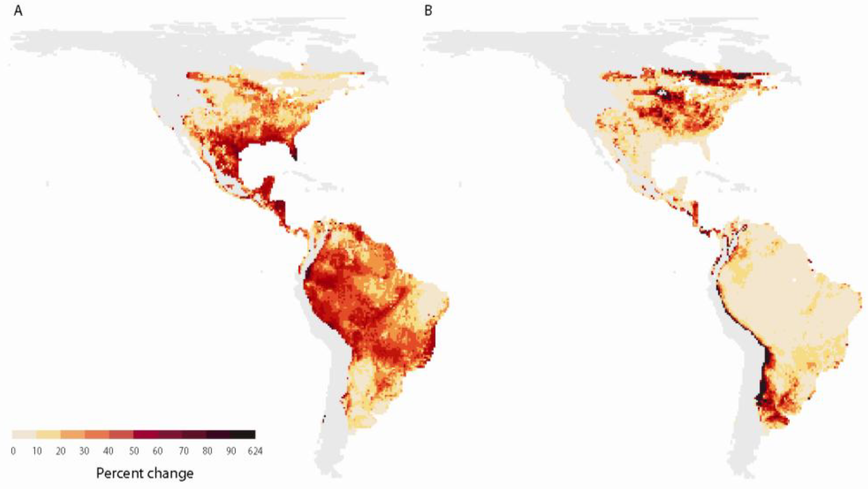 Predictions of (A) losses and (B) gains in amphibian species as a result of potential climate-driven shifts in species distributions. Predictions were based on 10 different climate projections for a mid-high (A2) greenhouse-gas emission scenario. Eighty percent (8 of 10) of the climate-change projections resulted in greater percent losses (A) and gains (B) in species richness than the values in these maps. The light grey areas indicate where small sample sizes precluded reliable estimates of change. These data and analyses are described in full in Lawler et al. [17].