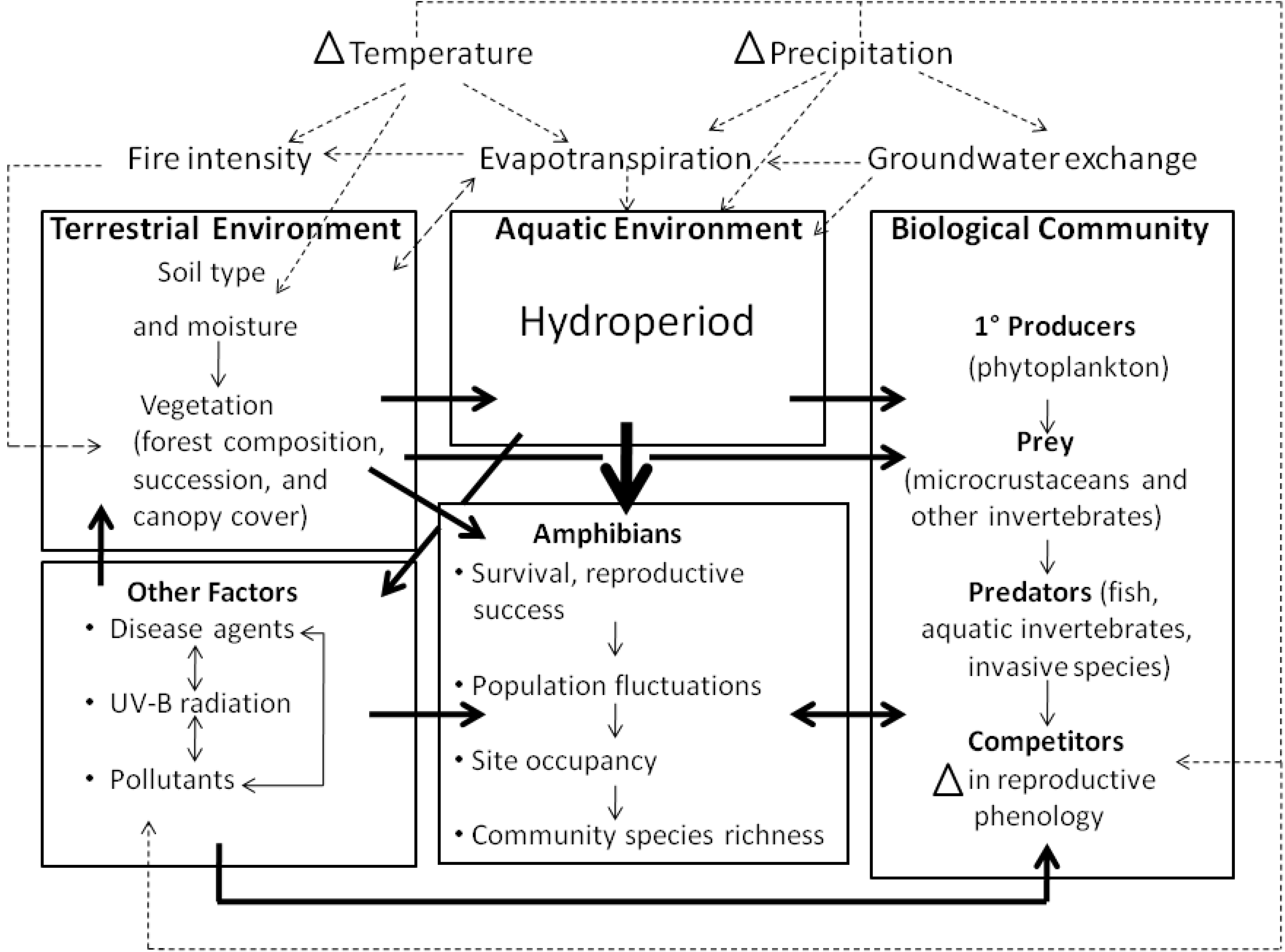 Conceptual model of pathways through which changes in temperature and precipitation may impact amphibian populations, using a generalized freshwater ecosystem as an example. Changes in temperature and precipitation affect amphibians via the effects of climate on terrestrial and aquatic habitats, the biological community in which amphibians are embedded and other factors such as disease agents, UV-B radiation and pollution. Factors that influence the availability of water, such as the hydroperiod of aquatic habitats, are likely the most important constraints on the reproductive success and persistence of amphibians (indicated by heavier arrow). Dashed arrows indicate interactions among meteorological variables, and their effects on biological communities and the environments in which they occur. Heavy solid arrows indicate relationships among compartments; light solid arrows indicate relationships within compartments.