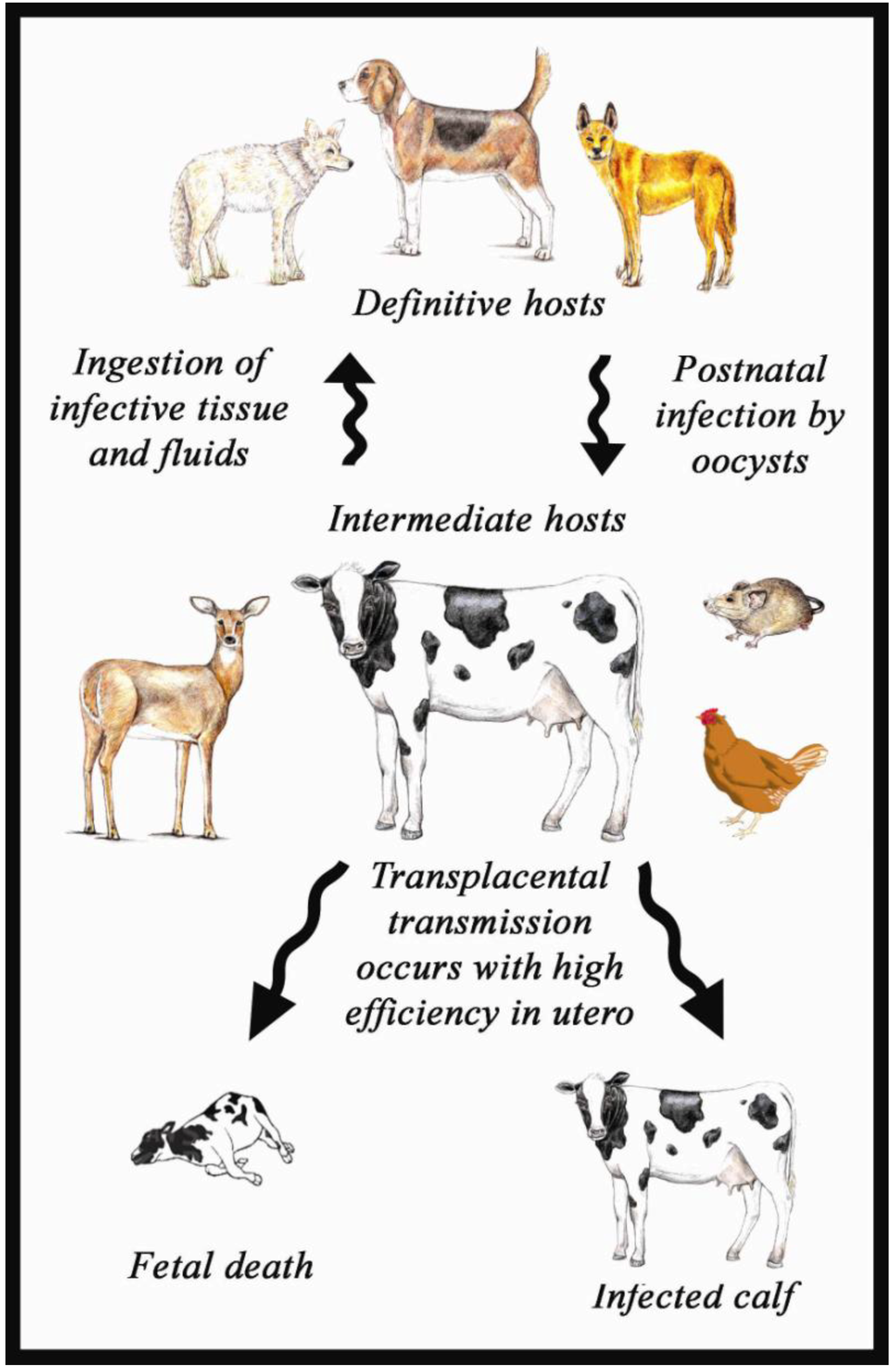 Tachyzoites can also cross the placenta to cause foetal infection [13,70]. Congenitally infected foetuses may die in utero, be resorbed, mummified, autolysed or a calf may be stillborn. In cattle, however, calves infected later in pregnancy, after the onset of development of the foetal immune system, tend to survive. They may be born clinically normal, but chronically infected [72,73,74]. Dams infected in this way can also pass on this infection during a subsequent pregnancy, and so infections are commonly found in family lines.