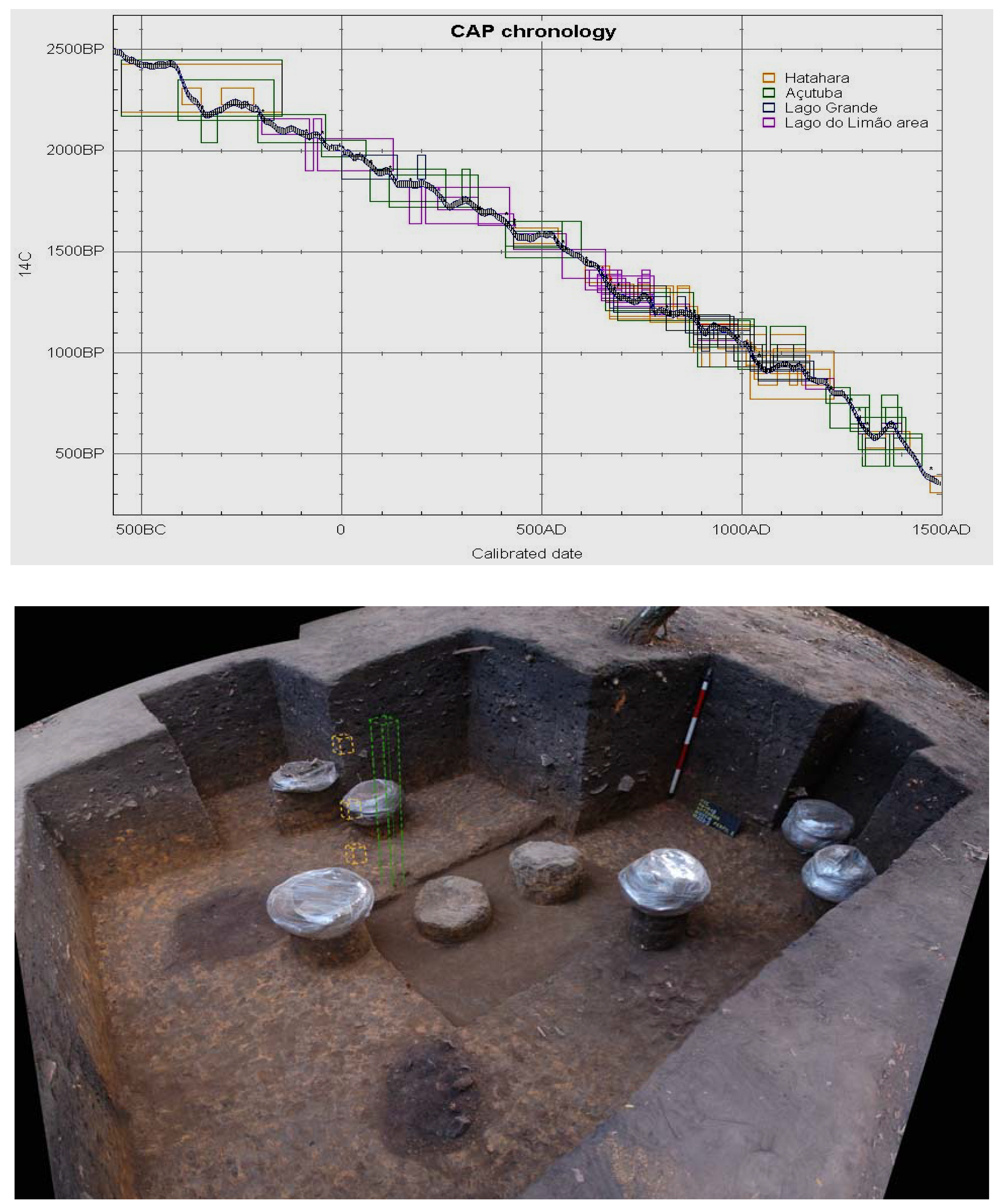 Top: Chronological synthesis of ceramic occupations of sites studied by the Central Amazon Project (current to 2006). Rectangles are calibrated age ranges (IntCal04.14c). Bottom: Excavations at the Hatahara site. Ceramic vessels left in situ are different-period funerary urns. Note features filled with darker sediments originating higher in the deposit. Dotted lines show sampling for geoarchaeological analyses.