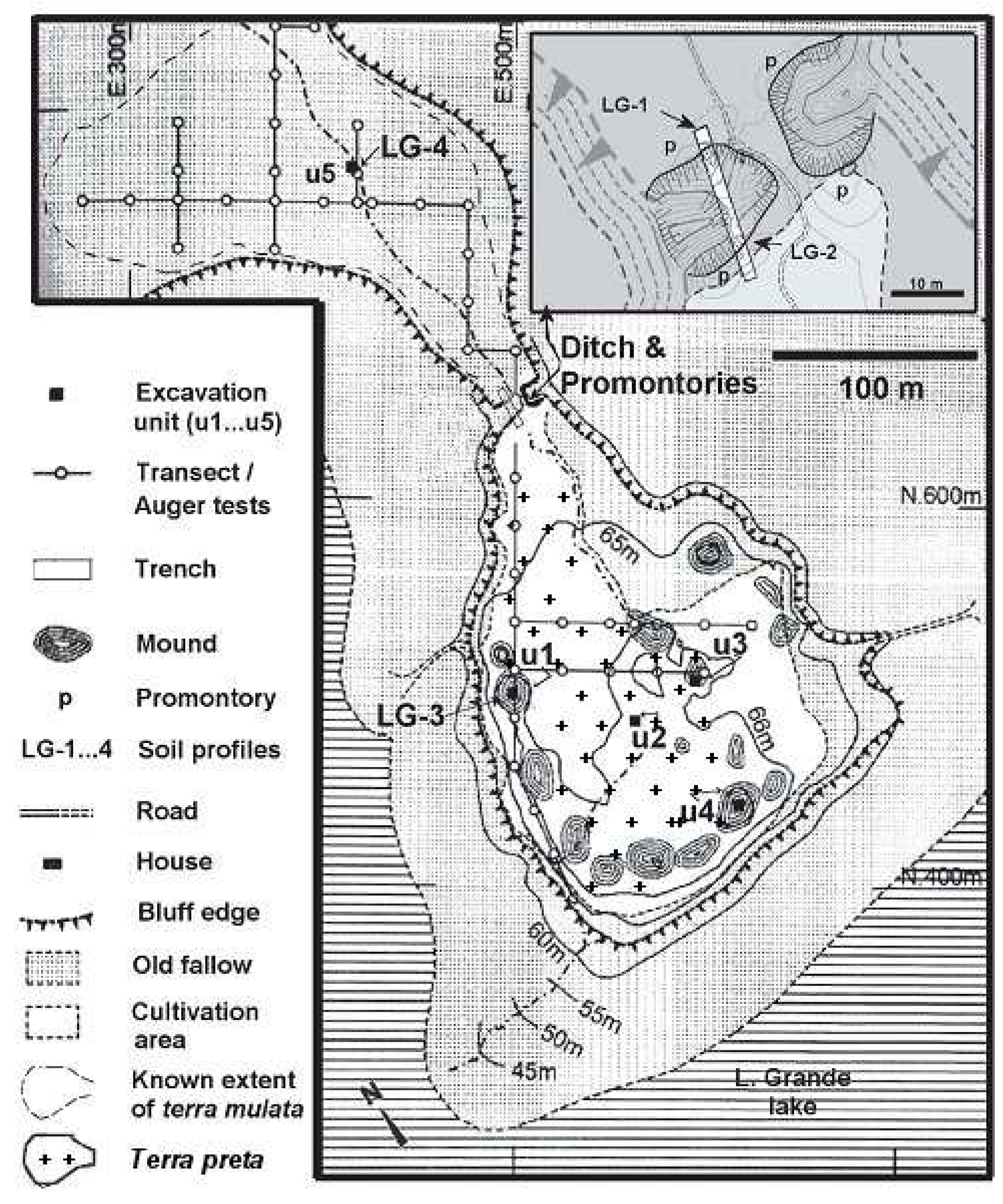 A plan of the Lago Grande site [adapted from 103] showing the distribution of terras pretas and terras mulatas, as well as sampling points discussed in the text.