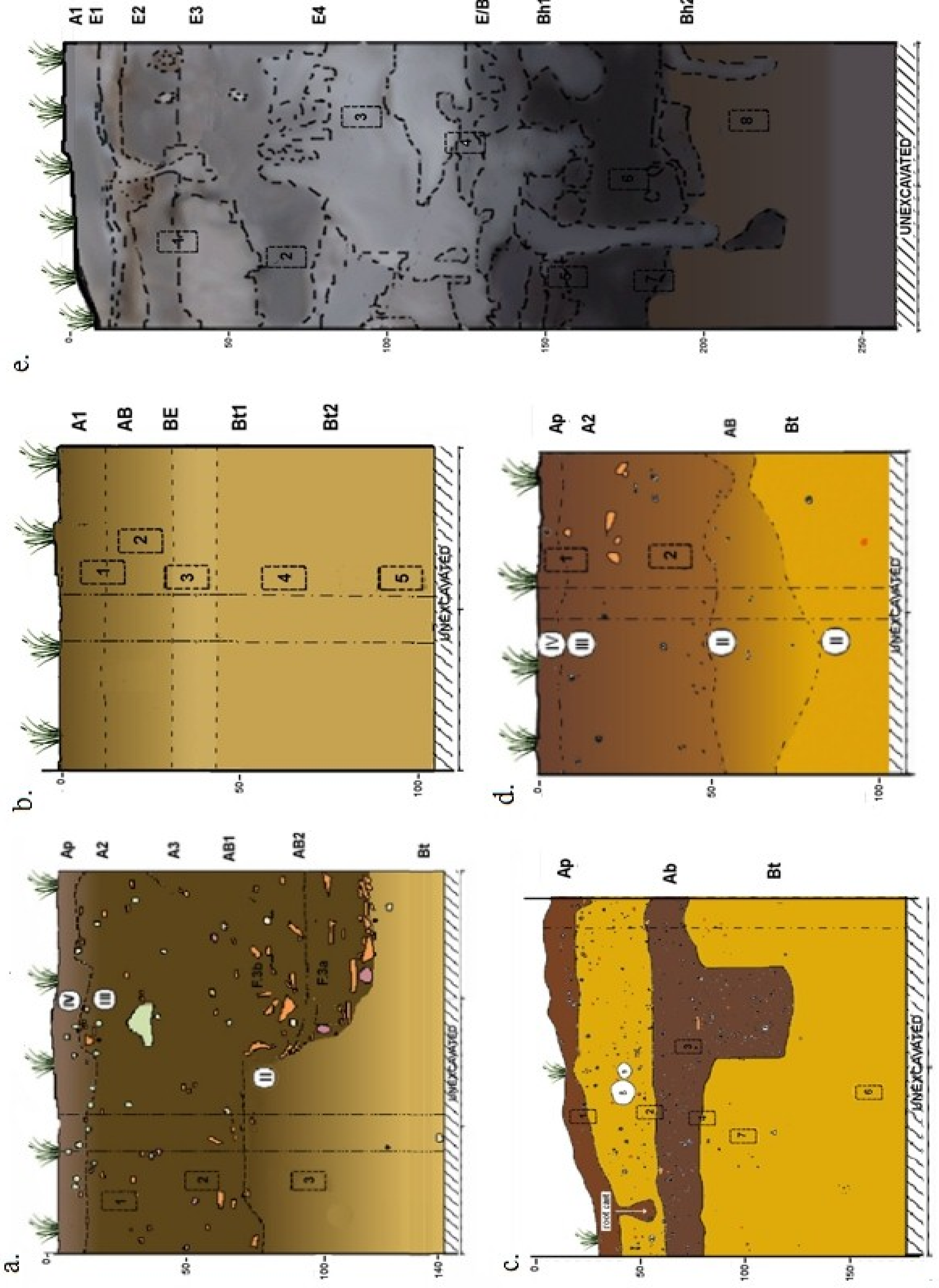 Profiles discussed in the text. (a) Hatahara site (see also Figure 2, bottom). (b) Control profile with sub-recent burning, same landform as Hatahara. (c) and (d) Lago Grande site: buried and exposed terra mulata profiles. (e) Dona Stella site.