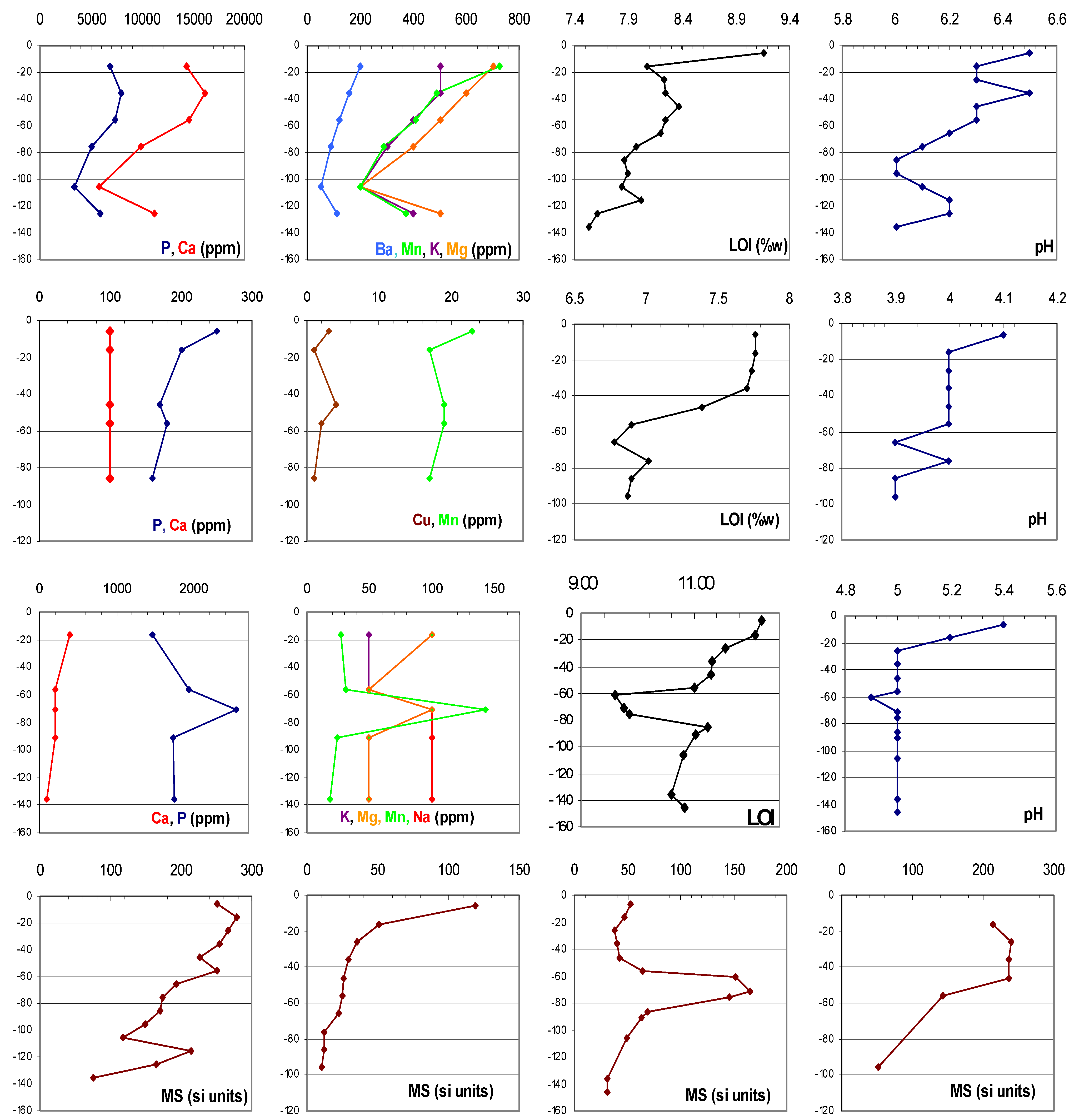 Rows 1-3: total elemental concentrations (measured by ICP-AES), carbon estimates (LOI, 550C), and pH (1:2 solution) plotted by depth. Row 1: Hatahara terra preta (Figure 4a). Inflection in lower part of the profile is at the same depth as an early 1st millennium AD occupation. Row 2: Yellow Latosol profile (Figure 4b) with sub-recent burning, same landform as Hatahara terra preta profile. Row 3: Terra mulata buried horizon at Lago Grande (Figure 4c). Row 4: Magnetic susceptibility values (Low frequency Tesla units, measured with a dual frequency Bartington MS2/MS2B sensor). From left to right: each of the previous three profiles and (bottom right) exposed terra mulata at the Lago Grande site (Figure 4d).