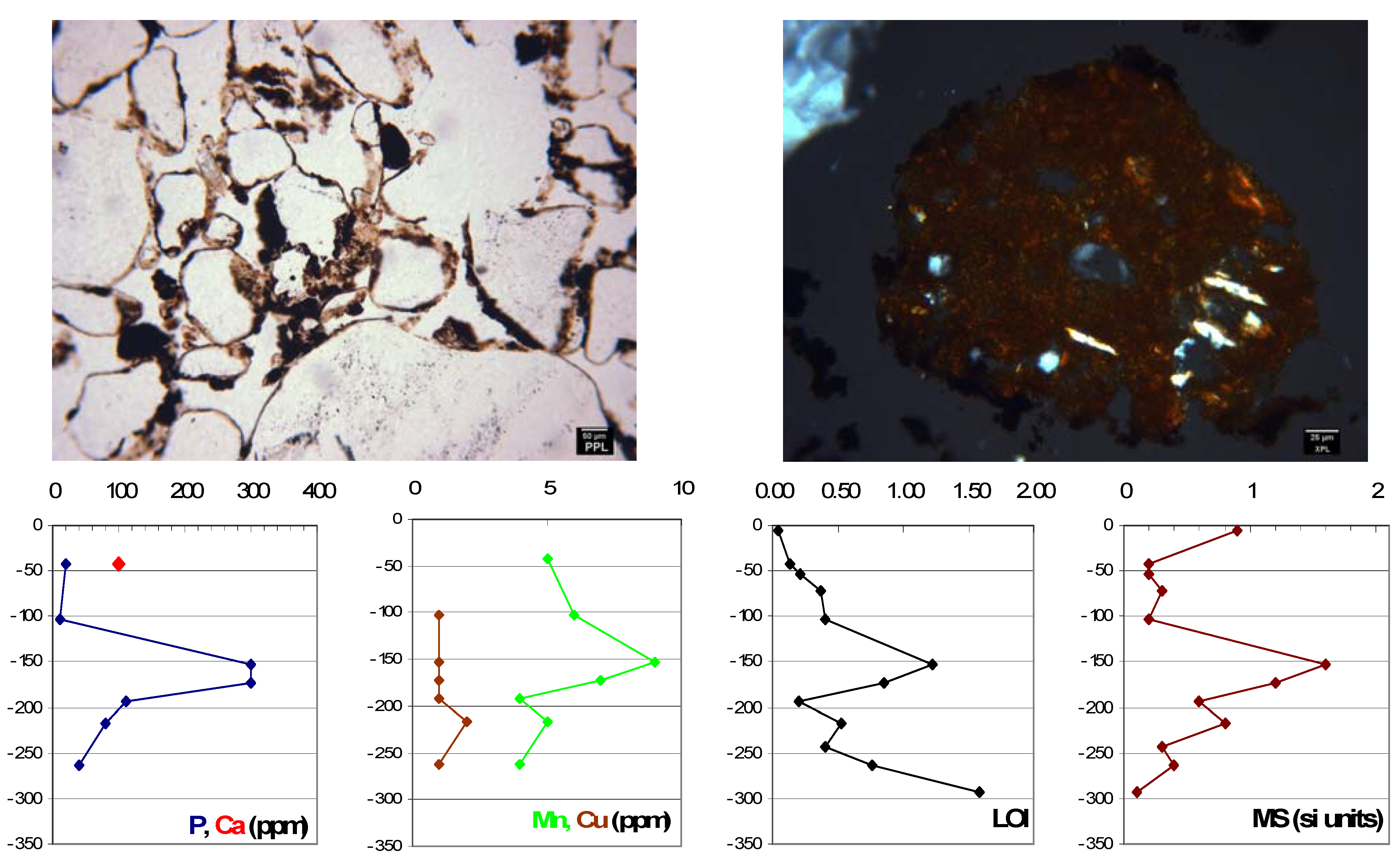 Top: Microphotographs of the buried horizon at the Dona Stella site. Left: charred plant matter embedded in the scant clay adhered to quartz grains composing the skeleton of the sediment. Right: microscopic fragment of burnt clay. The author believes it represents a microscopic fragment of ancient pottery. Very rare pottery shards are recorded at the site (Arroyo-Kalin, personal notes, 2006) but until now have been regarded as intrusive from later occupations. Bottom: total elemental concentrations (measured by ICP-AES), carbon estimates (LOI, 550C), and magnetic susceptibility values (Low frequency Tesla units, measured with a dual frequency Bartington MS2/MS2B sensor) from the Dona Stella site (Figure 4e).