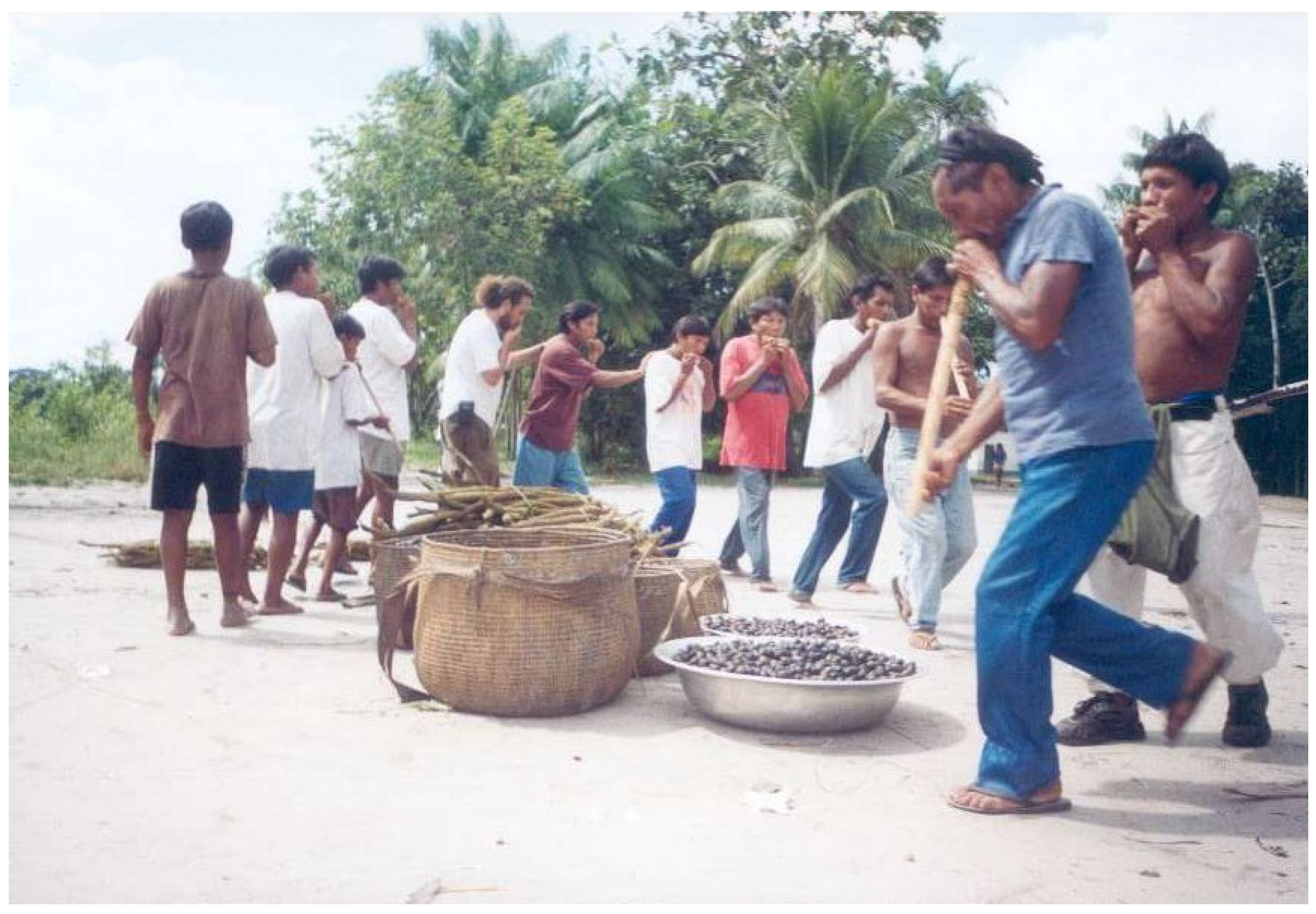 A dabacuri feast in the village of Matapi, at the mouth of the Tiquié River, upper Negro River. Tukano and Yuhupdu who live in this village have little access to agricultural land and rely on exchange with communities upstream to obtain manioc (Arroyo-Kalin, field notes, 2001). In the photo, however, they have the upper hand in a fluid system: the Tukano village elder has asked the neighbouring Yuhupdu community to collect Inga and Patauá and offered to supply manioc cuttings, acquired from other Tukanoan groups, in exchange.