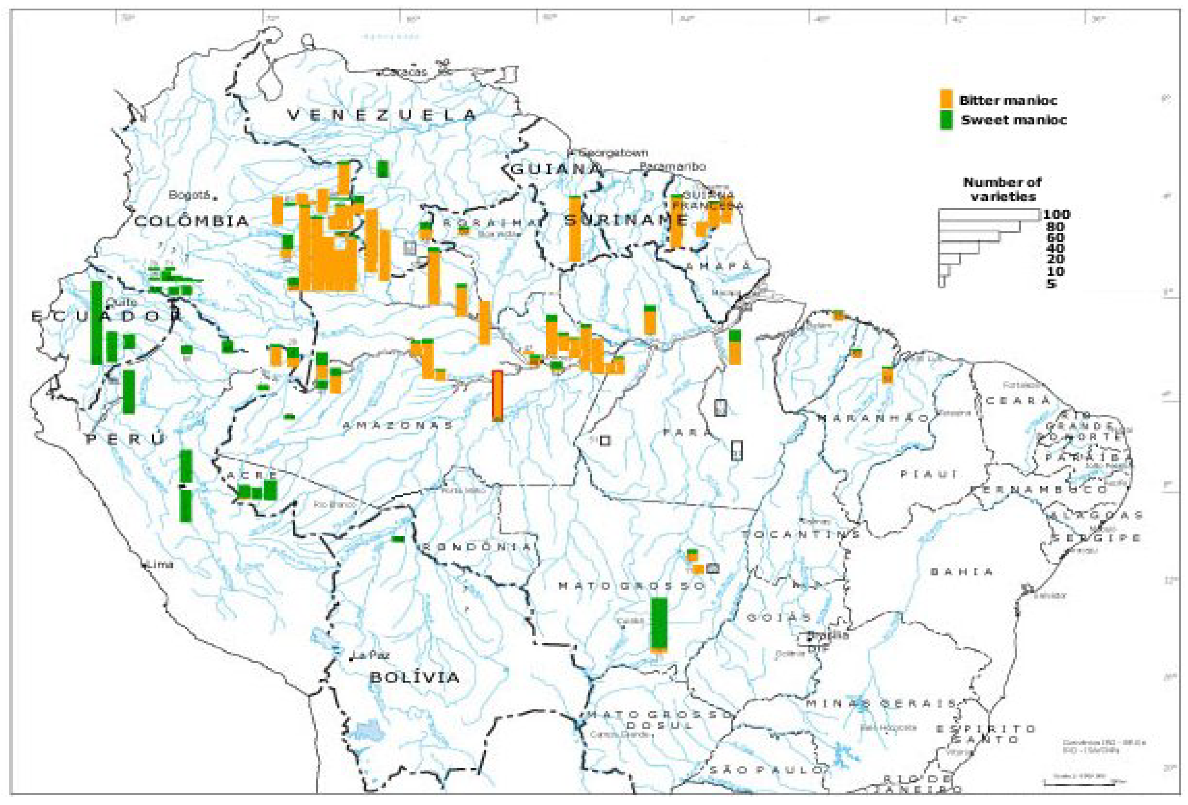 Map of bitter and sweet manioc varieties compiled from ethnographic sources by Emperaire [144], modified with permission. Bar with red outline in the middle Madeira River region reflects caboclo dataset presented by Fraser [120].