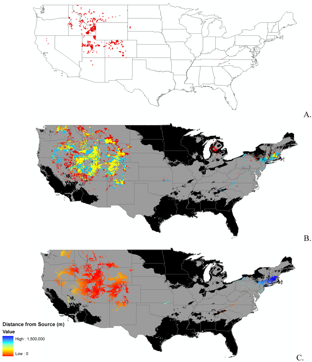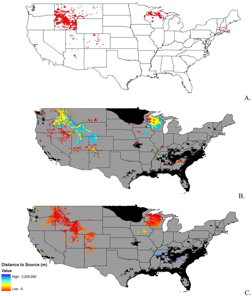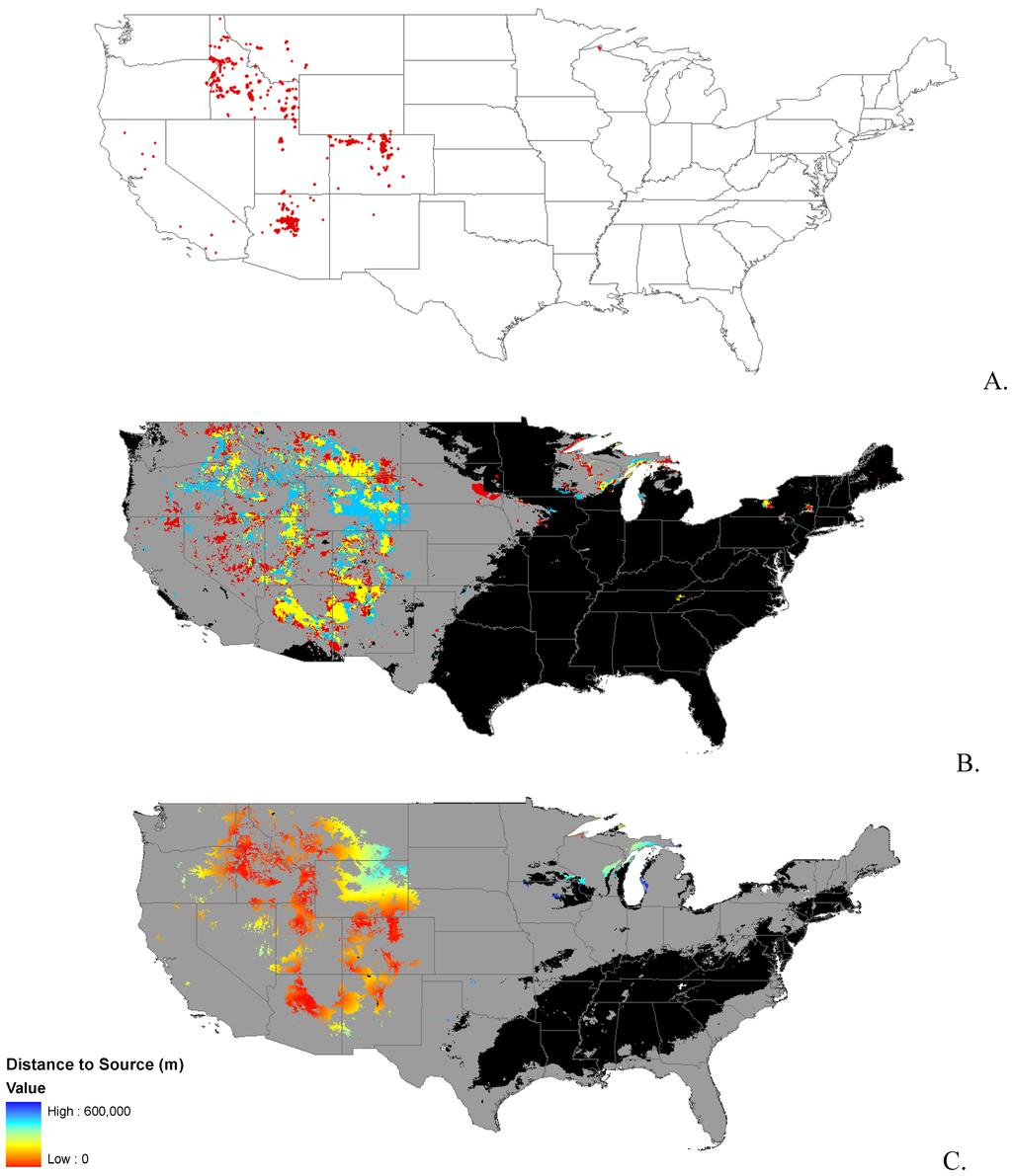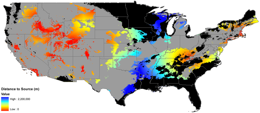 Finally, we were interested in finding a surrogate for dispersal of the species. We did not have detailed data available for dispersal mechanisms of each species, so we used distance from known seed source, or nearest data point. For this part of the analysis, we used the clamping and unsuitable habitat surfaces for each species as a mask, effectively excluding these areas from the analysis. We used the straight line distance function in Spatial Analyst of ArcMap [34] to create a surface of the distance from the nearest known presence point. This is a simple first order approximation of invasibility as defined by both suitable habitat and available propagules.