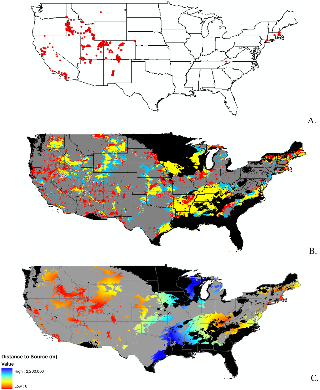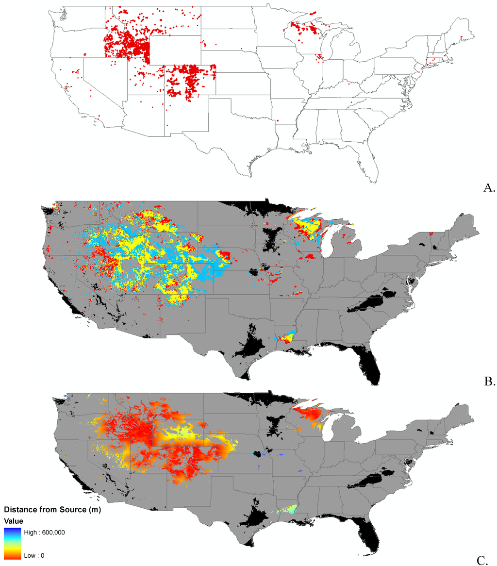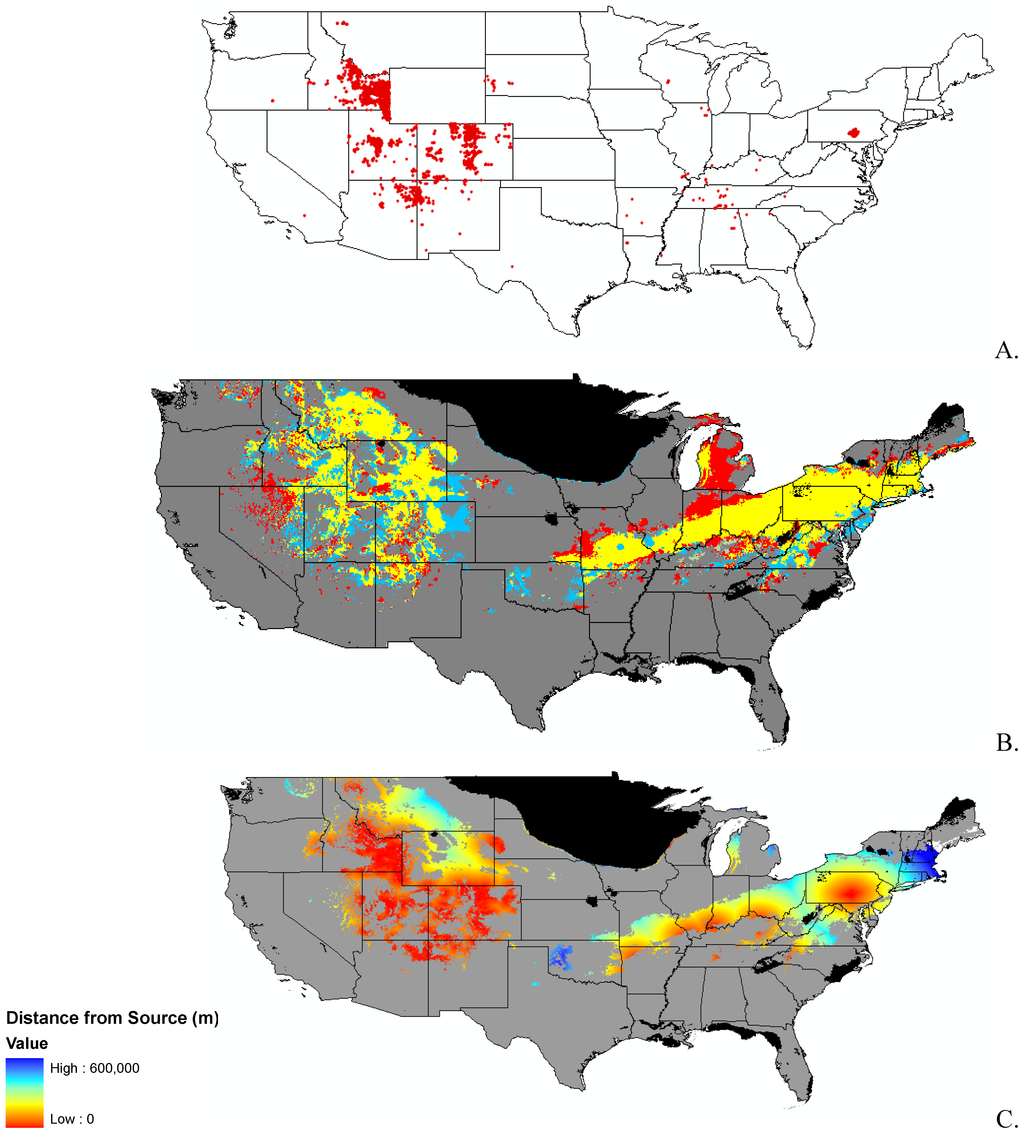 Finally, we were interested in finding a surrogate for dispersal of the species. We did not have detailed data available for dispersal mechanisms of each species, so we used distance from known seed source, or nearest data point. For this part of the analysis, we used the clamping and unsuitable habitat surfaces for each species as a mask, effectively excluding these areas from the analysis. We used the straight line distance function in Spatial Analyst of ArcMap [34] to create a surface of the distance from the nearest known presence point. This is a simple first order approximation of invasibility as defined by both suitable habitat and available propagules.