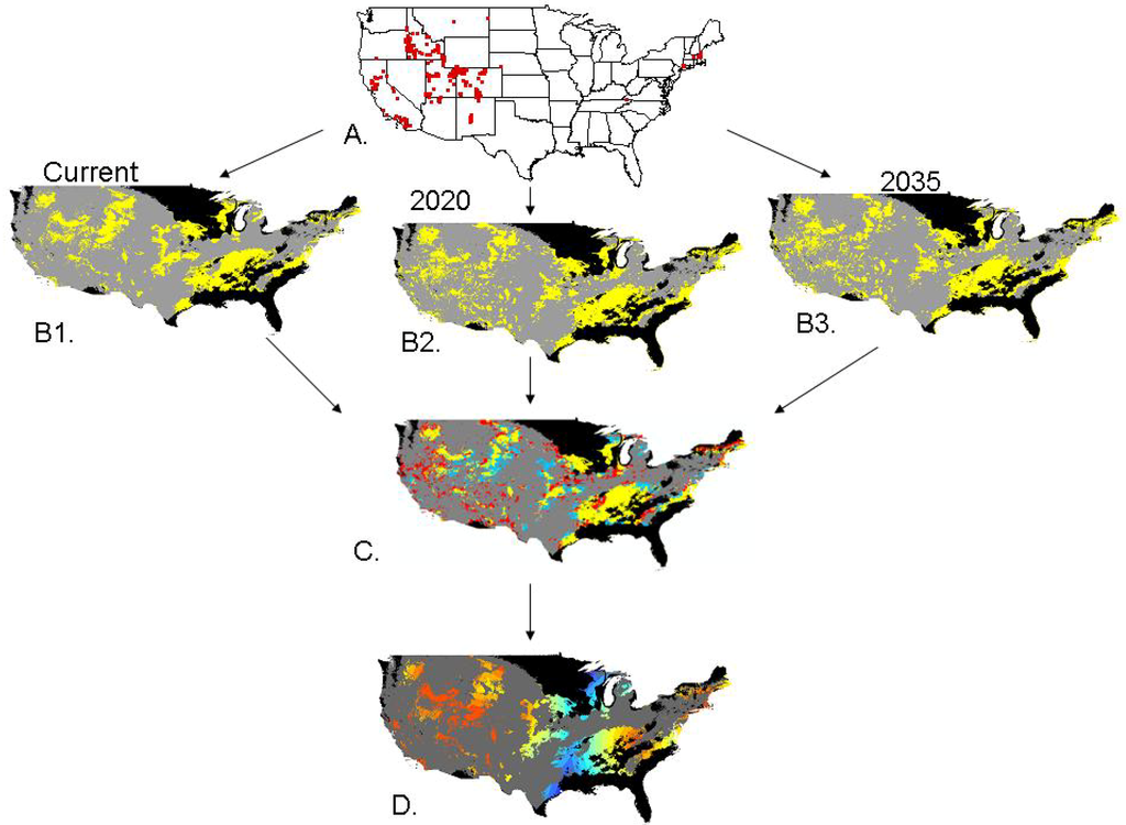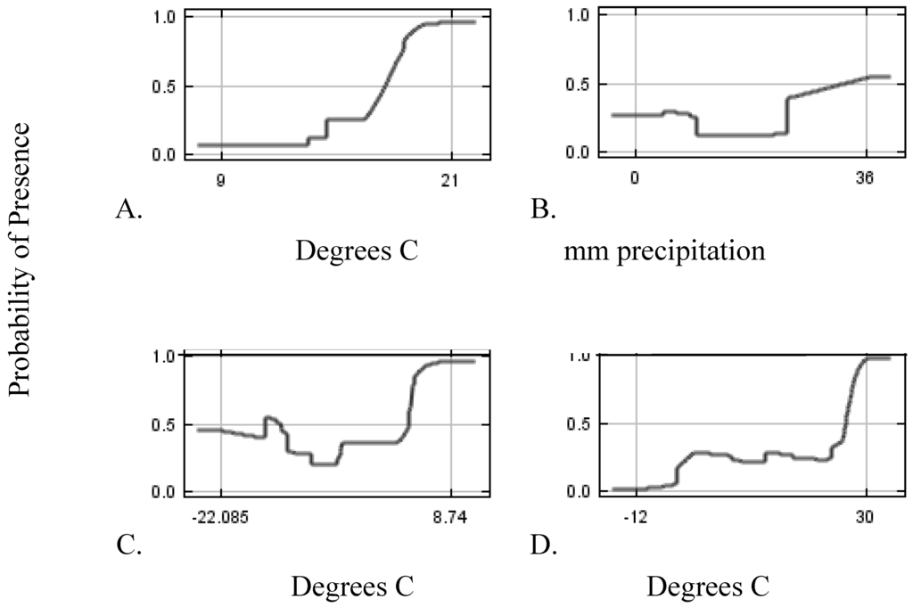 Broad scale distribution models are rapidly gaining acceptance. Morisette et al. [22] used climate envelope modeling to model current tamarisk potential habitat at a 1 km2 resolution for the continental United States using logistic regression with an Area Under the receiver operating characteristic Curve (AUC) of 0.95, but this model did not address climate change. A worldwide bullfrog model was created at a 10-minute resolution for current conditions [23]. This model had a very wide distribution, but a coarse resolution. Bradley et al. [12] created models at a 4-km2 resolution using Mahalanobis distance for five invasive plants in the United States for the year 2100, a management level geographic scale, but a very coarse time scale. We integrated aspects of these studies, by examining a management level resolution, a country level distribution, and a near term time scale.