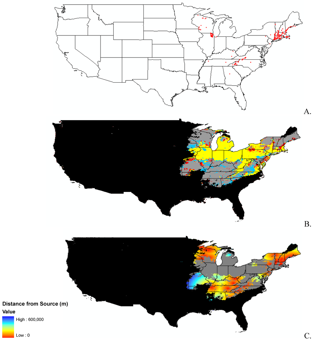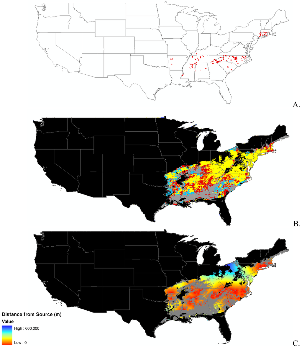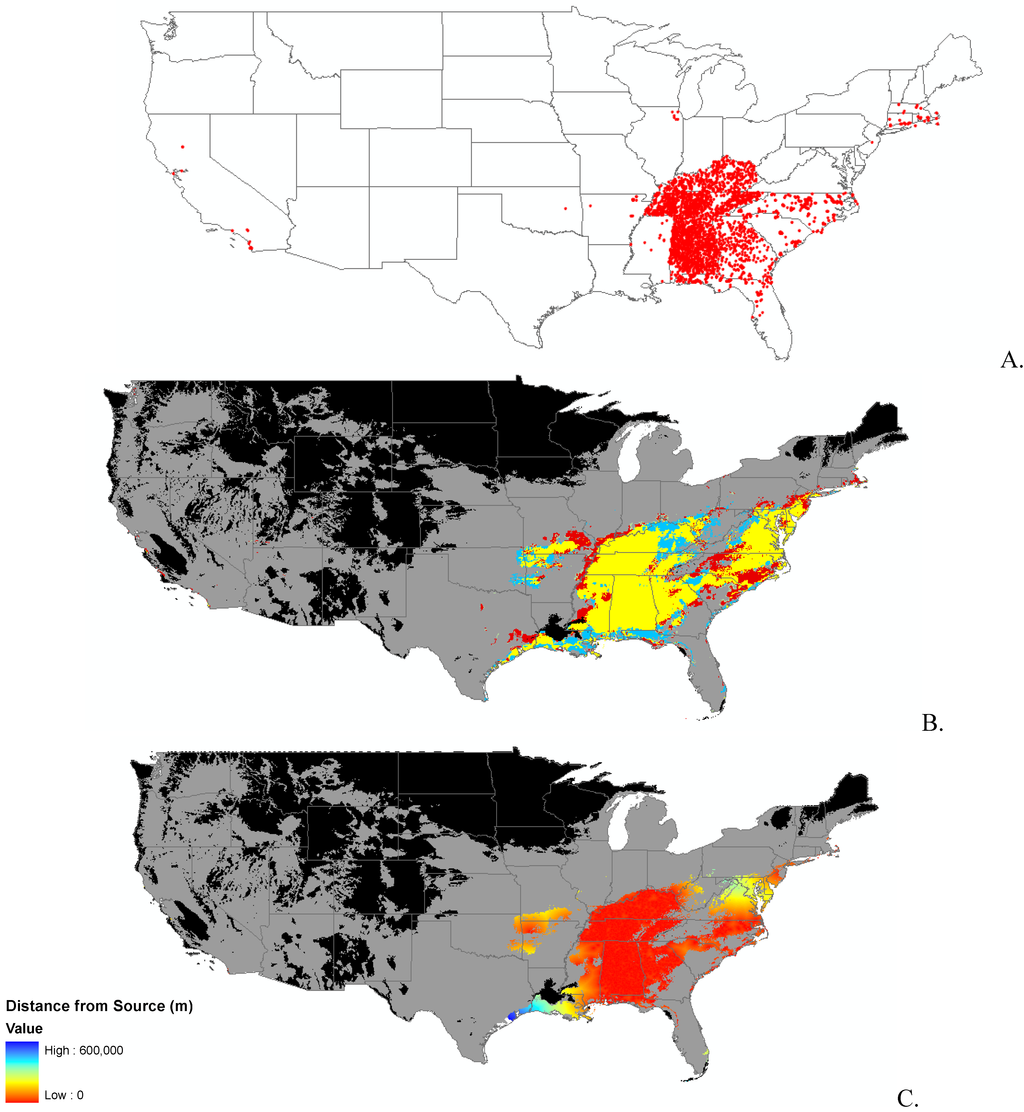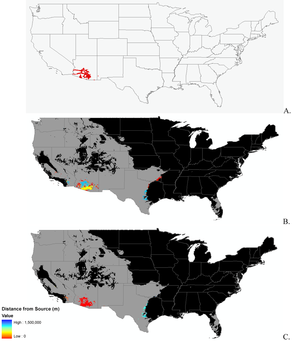 We recognized that these maps of potential habitat suitability do not address propagule pressure, predation by natural enemies, or other biotic interactions [23]. The next step was to examine how a species might spread and where. We used the current potential suitable habitat model as a mask and developed a distance from seed source surface as a proxy for propagule pressure, a rudimentary invasibility index to address this issue.