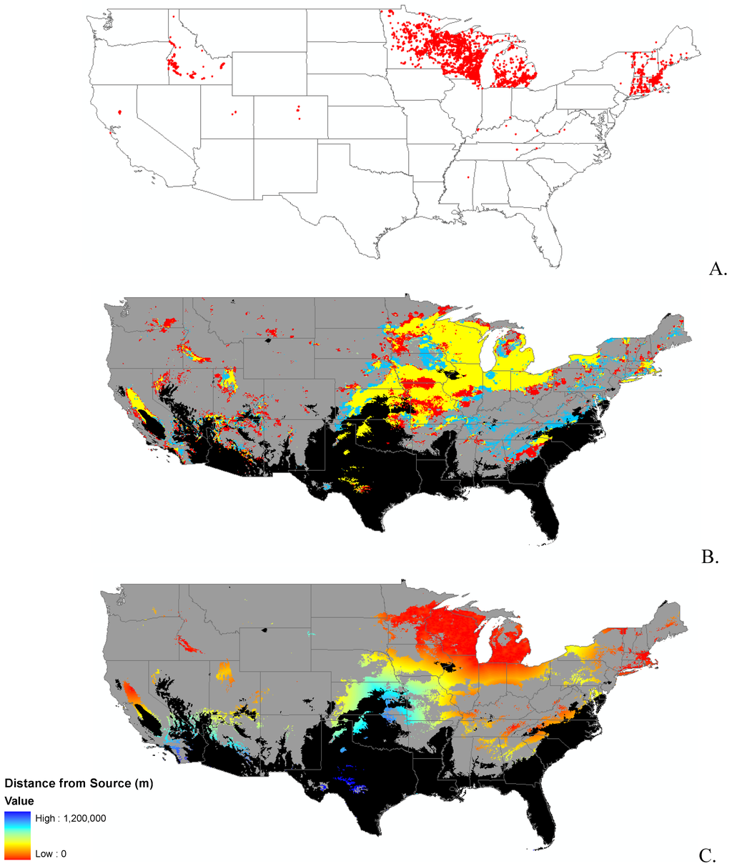 Species-environment matching models start from a distribution of presence points on a landscape. These data do have drawbacks; they do not provide any information on abundance or absence of the species of interest. There also may be many gaps in the data that are used. Less than 1% of any landscape can be affordably measured [17], and we must use what data we have available. These models are a starting point in an iterative process, informing managers of where potential distributions may lie and giving an idea of where to add surveys, and where to sample in the future [18]. Distribution models form the basis of an excellent first approximation map that is especially applicable for early detection programs [19].
