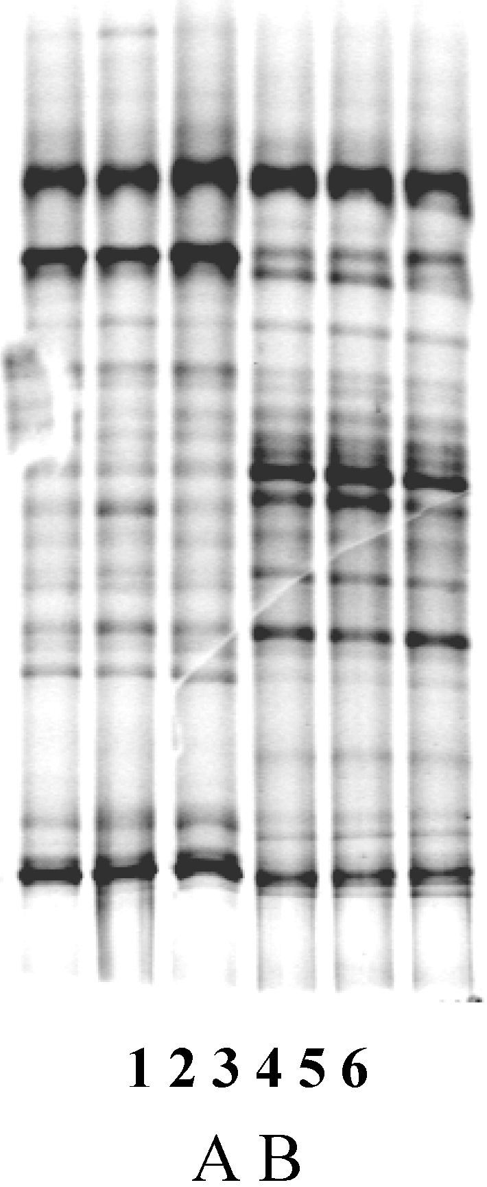 Variation within stool sample. DGGE profiles (V6-V8) region of two stool samples (A and B) in the front of the fecal pellet (Lanes 1 and 4), the back (lanes 2 and 5) and a homogenized sample (lanes 3 and 6). DGGE was performed on an 8% [wt/vol] acrylamide gel with a gradient from 40% at the top to 50% at the bottom at a temperature of 60 °C. 100% denaturing conditions were defined as 7M urea and 40% formamide. Gels were run for 16 h at 65 V and stained with Cyber Green. Gels were scanned in using Quantity One (Biorad) and analyzed using Diversity Database software (Biorad). Microbiota diversity in profiles was compared (i) by generating dendograms based on similarity matrixes calculated using Pearson and Dice coefficients and (ii) by calculating the Shannon Diversity index for each profile based on the number and intensity of bands.