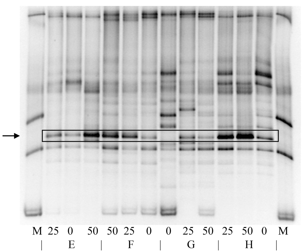 Effects of RM on microbiota. DGGE profiles for subjects E, F, G, H on Day 24 during placebo (0), RM 25 (25) and RM 50 (50) intervention periods. M = molecular marker, black arrow indicates position of band increased during RM supplementation (box). DNA was eluted from the marked band and submitted to sequencing. DGGE gels were run and diversity in each profile was calculated as described in Figure 1. Profiles for each individual are presented in the order that they received each intervention.