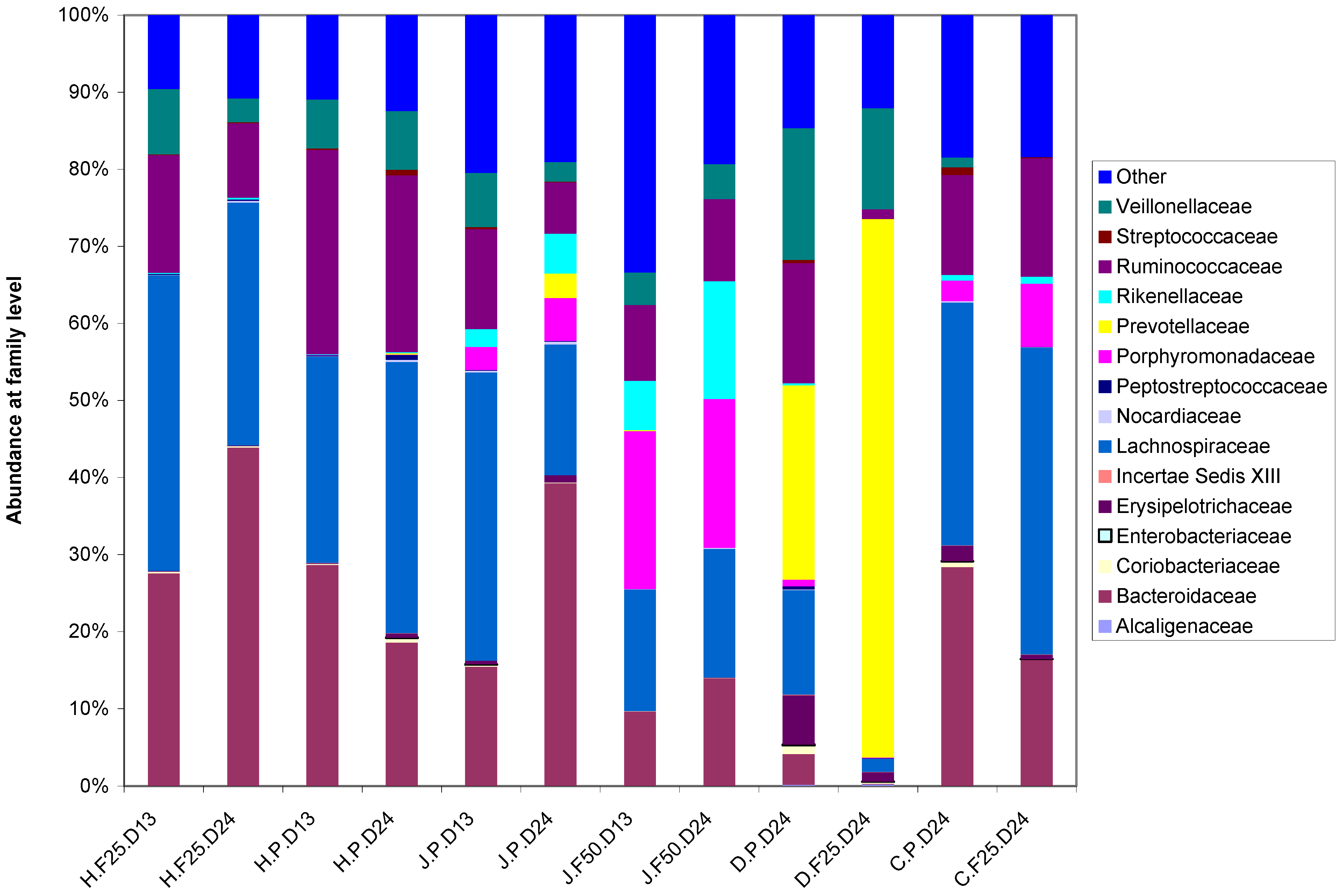 454 sequencing for microbiota variation. 16s rRNA based abundance of dominant OTU’s on the family level. OTU’s grouping to each of the 15 most dominant OTU’s and all other OTU’s combined are color coded. 16S rRNA sequences were analyzed using the RDP pyrosequencing pipeline using standard settings for removal of low quality reads. Samples from subjects H, J, D, and C were analyzed during placebo(P), RM25 (F25) or RM50 (F50) on days 13 (D13) and Day 24(D24). Each column shows the bacterial composition of one fecal sample based on Megablast searches against the Greengenes database. Except for samples H.F25.D24 (H 25 in Figure 2) and H.P. D24 (H 0 in Figue 2) samples differ from those shown in Figure 2.