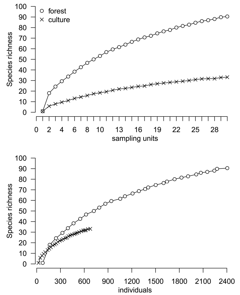 Such differences in the rarefaction curves may be explained by very marked differences in species spatial patterning i.e., aggregation and environmental heterogeneity leading to more species being sampled at low sampling intensity in the cultivated plot. The point here is that such different systems as an old secondary tropical forest and a cultivated plot differ by many ecological aspects amongst which the overall organism density and diversity. Controlling for possible confounding density effects may not always be adequate and might even be a confounding operation in itself.
