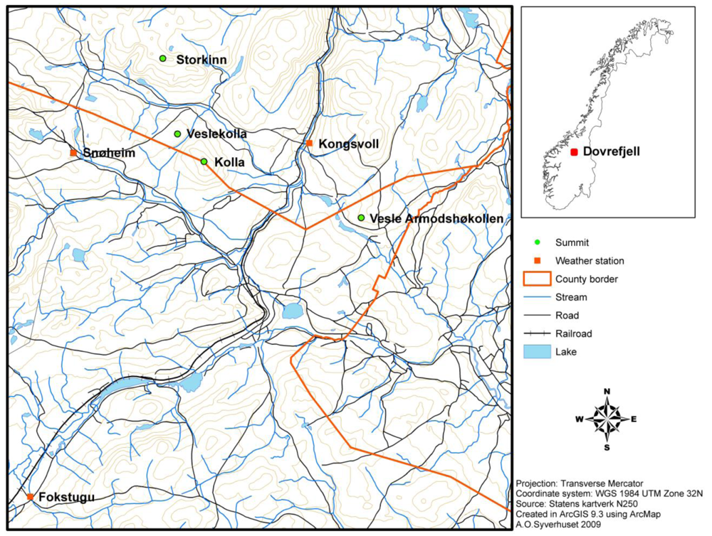 The area is divided by the Drivdalen valley, which goes in a north-south direction (the railroad in Figure 1 follows the valley). Three of the summits are located to the west of the valley. These parts of the Dovrefjell area are dominated by old Precambrian bedrock which mainly consist of resistant and often strongly metamorphosed rocks. At the summits Storkinn and Veslekolla, the bedrock mainly consists of metamorphosed sandstone, whereas at Kolla, the bedrock consists of gneiss, granite and anorthosite. In the eastern parts of Dovrefjell the bedrock belongs to the Trondheim field, where the bedrock originates from the formation of the Caledonian mountain range. The lowest summit, Vesle Armodshøkollen, is located to the east of Drivdalen valley, and the bedrock at this summit consists of greenstone and amphibolite [34,35]. Vesle Armodshøkollen is characterized by a rich alpine flora, whereas the mountains to the west of Drivdalen have lower species richness [36].