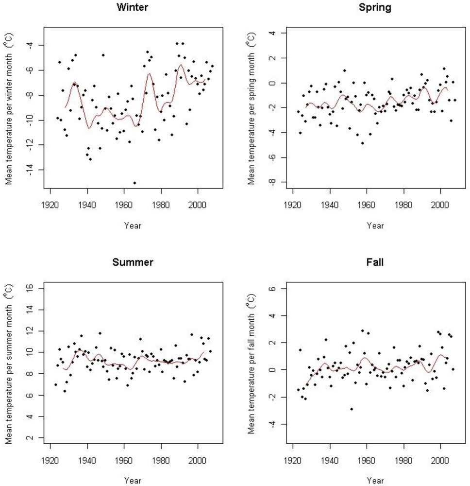 In order to correct for seasonal and random variation in each of the 16 time series of soil temperature, time series were decomposed for monthly means into trend, seasonal and remainder components using a seasonal trend decomposition procedure based on Loess (STL) [48]. Missing values were replaced with the average temperature for that month for all other available years. A straight line model was fitted to each of the resulting trend curves to see if there was a tendency of temperature increase in the soil.